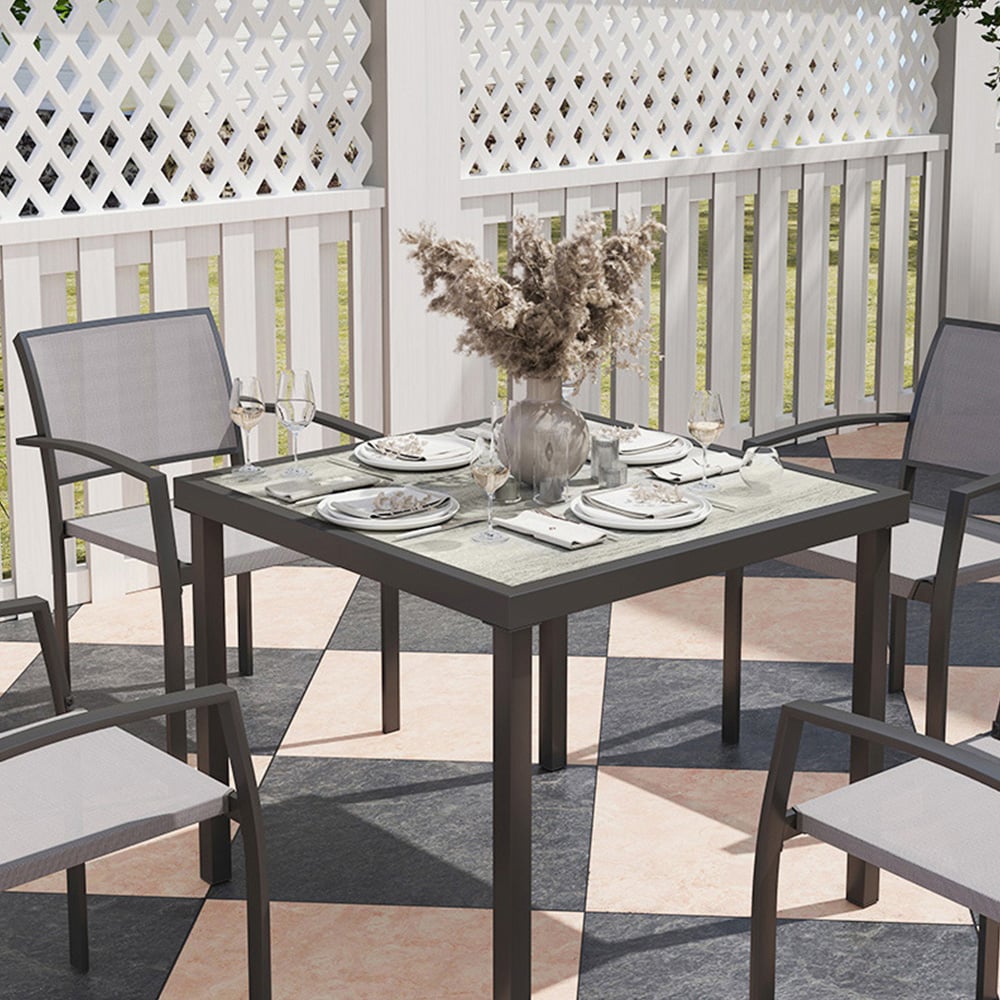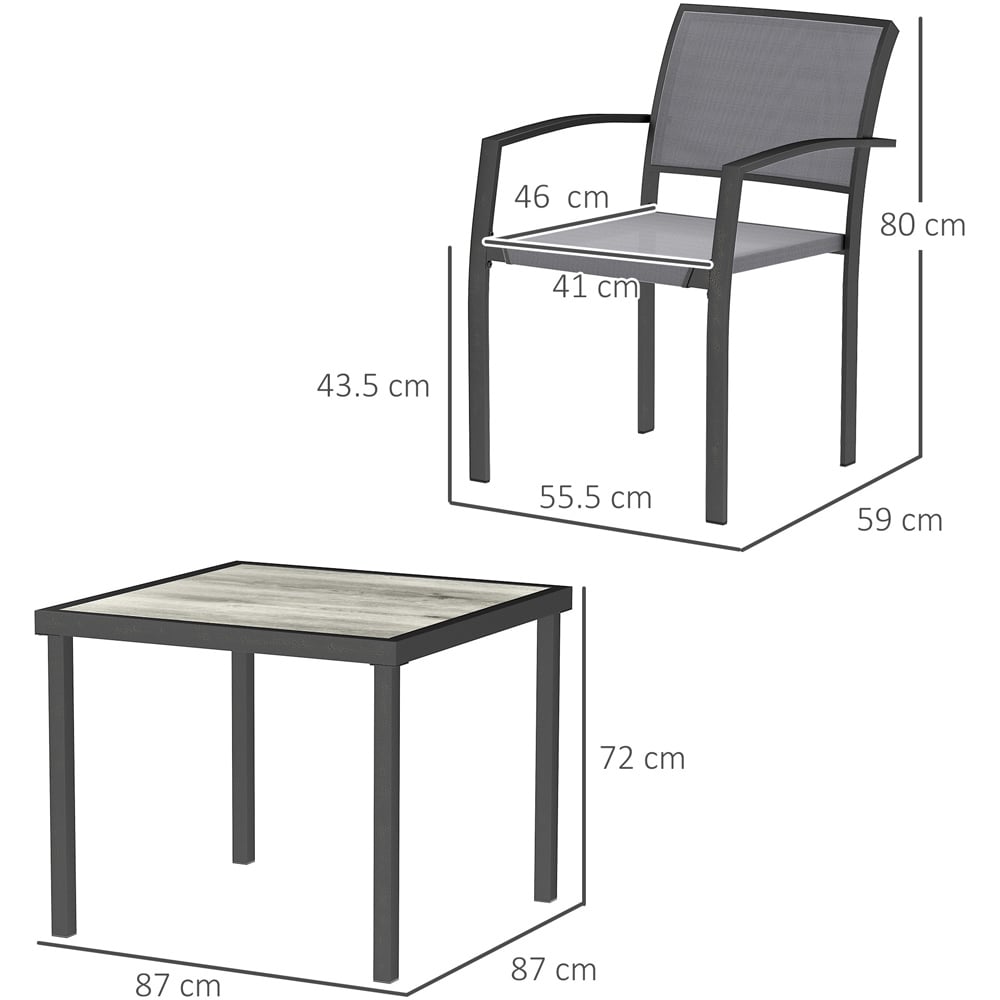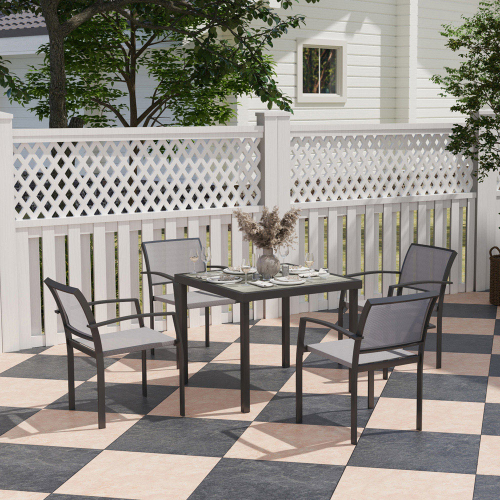 Create a stylish and comfortable outdoor dining area with the Outsunny five-piece set. This charming ensemble features a square table with a chic wooden-grain top – a beautiful blend of elegance and resilience. Four stackable chairs, upholstered in breathable Texteline fabric, ensure relaxed comfort for everyone. Perfect for al fresco dining, this set effortlessly elevates your garden experience, offering both style and practicality.