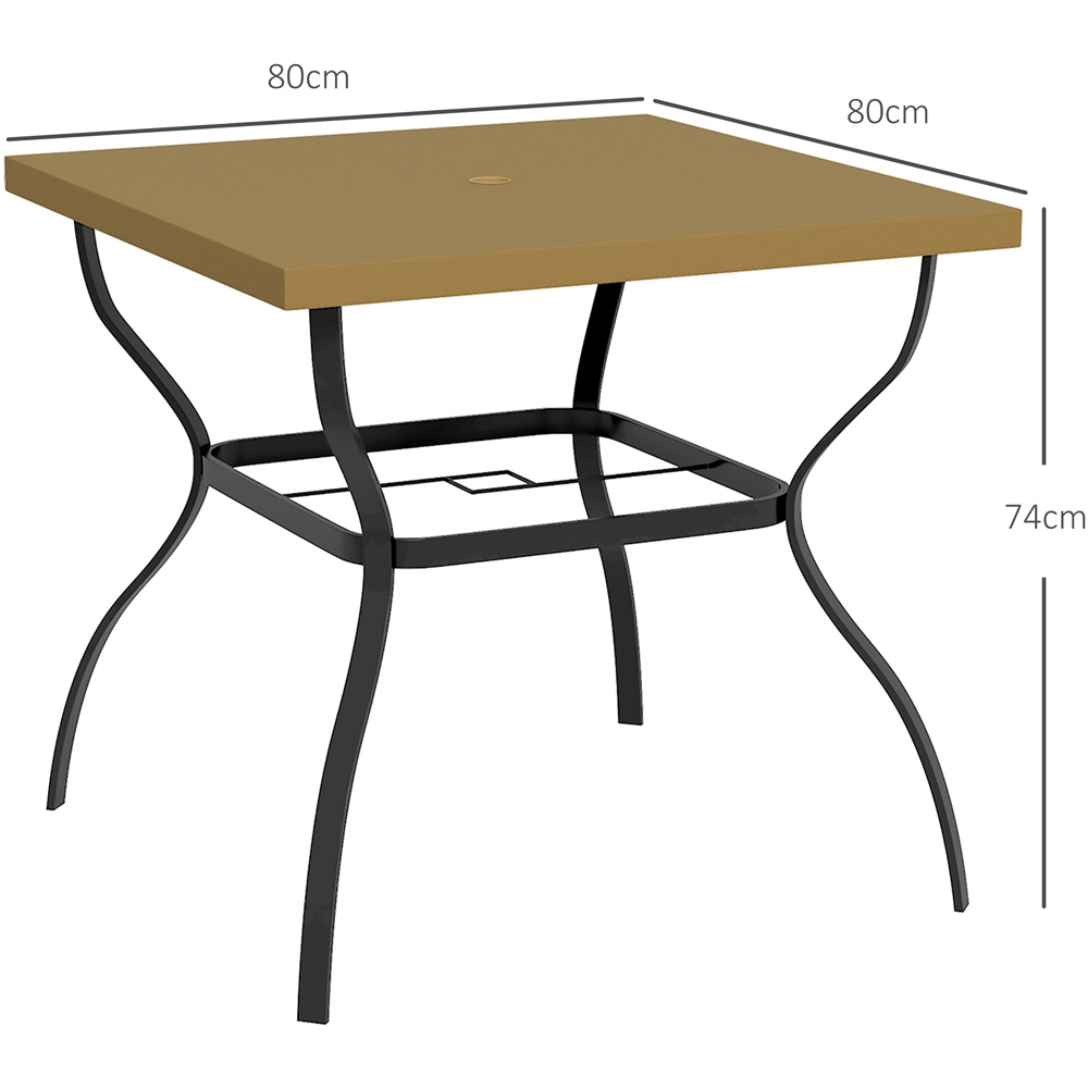 Perfect for al fresco dining, this square garden table offers both ample space and welcome shade. Its 80cm tabletop comfortably seats four, ideal for enjoying meals with friends and family. A thoughtfully placed 44mm central hole securely holds a parasol, providing protection from the sun. Crafted from robust steel, this durable table is built to withstand the elements, making it a reliable addition to your garden all year round.