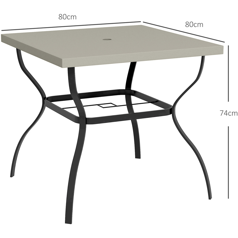 Enjoy al fresco dining with this sturdy square garden table. Perfect for four, its 80cm tabletop offers ample space for gatherings. A central 44mm hole securely holds a parasol, providing welcome shade. Crafted from robust steel, this table is built to withstand the elements, making it ideal for year-round outdoor use.
