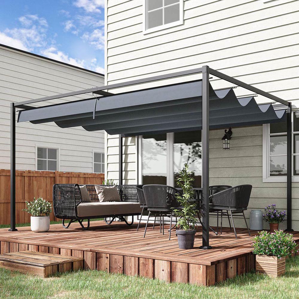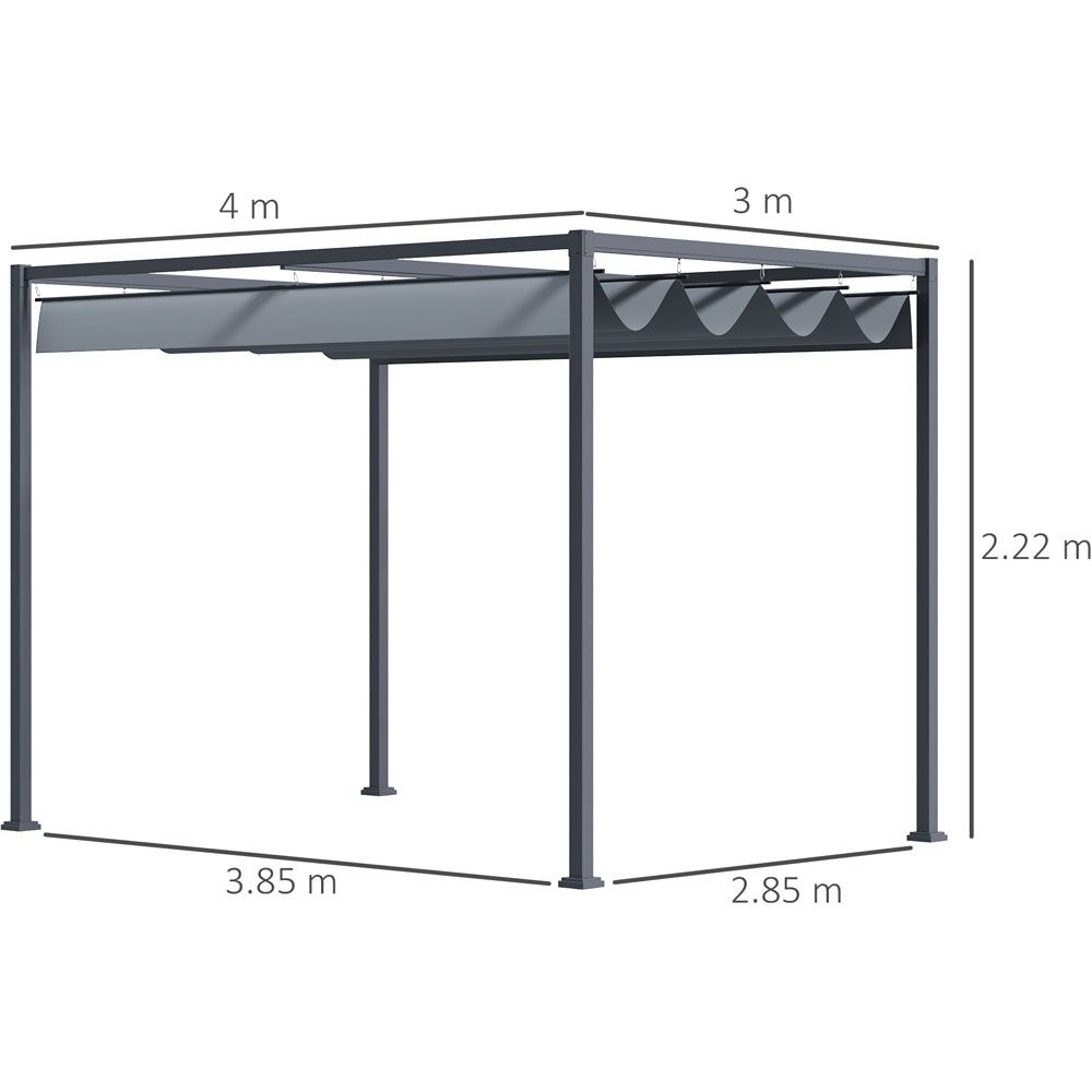 Impress your guests at outdoor gatherings with a beautiful and functional Outsunny 4 x 3m Metal Pergola Retractable Gazebo. It's fitted with a top adjustable canopy to protect underneath no matter the direction. Crafted from a metal frame - this tough structure is powder coated for extra strength. The UV-resistant canopy helps to protect you from sun damage for safety outdoors.