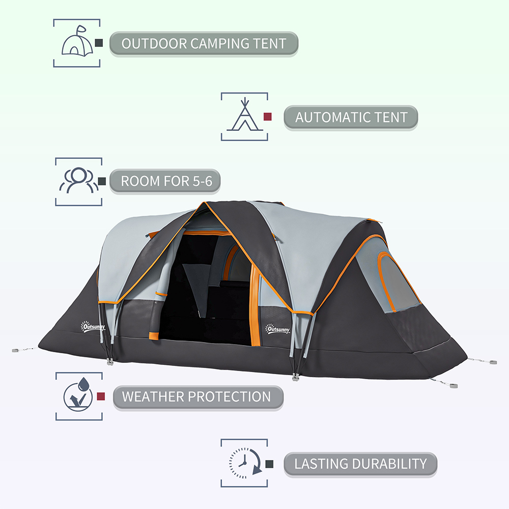 Make camping even more fun and exciting with the Outsunny 5-6 Person Camping Tent Multicolour. This camping tent comes with a large room, ideal for five to six people. It features easy-to-enter doors with mesh windows for fresh air circulation. This double-layered camping tent also features a 3,000mm water-resistant and UV-resistant, 210T polyester fabric shell. The top sheet can be removed to see the sky at night through the mesh fabric cover. It is crafted using a sturdy steel and fibreglass pole structure that stands upright and stable with the help of guy ropes and ground stakes that can be secured to the ground. It also includes a carry bag for convenient portability while travelling.