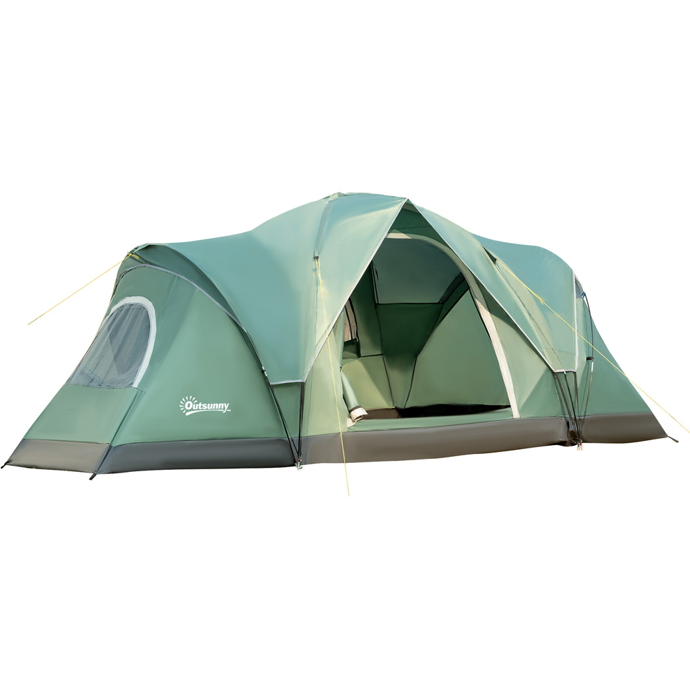 Experience the ultimate in camping comfort with the Outsunny 5-6 Person Waterproof Dome Camping Tent Dark Green, accommodating up to five for sleeping and seating up to six. The sturdy steel and fibreglass poles ensure a reliable structure that resists rust and damage, maintaining stability throughout your outdoor adventure. Crafted with high-quality 210T polyester, the two-tier design boasts a waterproof rating of PU 3000 mm+, providing exceptional protection from wind and sun. At night, you can easily remove the top sheet to gaze at the stars through the mesh fabric. Enjoy the convenience of a zipped entrance door for privacy and security, while strategically placed windows promote airflow. Inner bags provide designated storage for your belongings, and a middle top hook is available for hanging an electric light (not for open flames). The package includes 14 ground stakes, 6 guy ropes, and a carry bag for easy transport. Overall Dimension: H180 x W230 x L455cm. Door Dimension: H130 x W136cm.