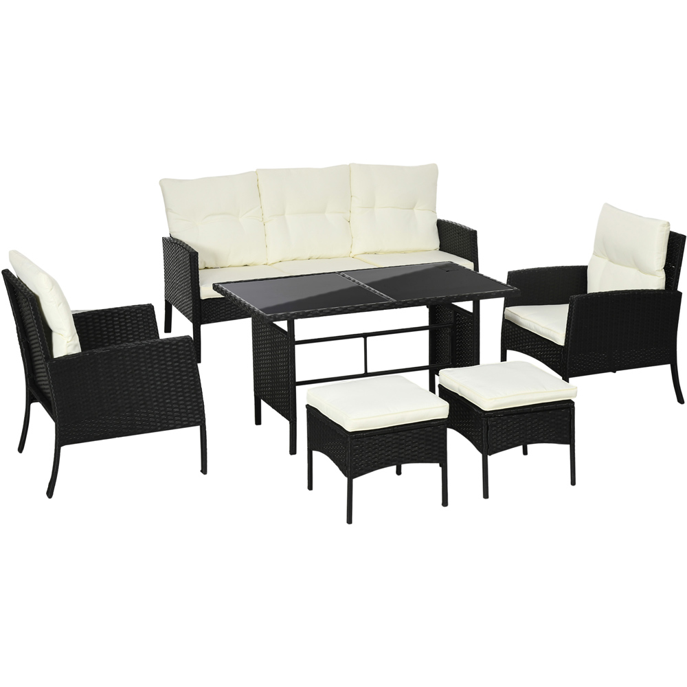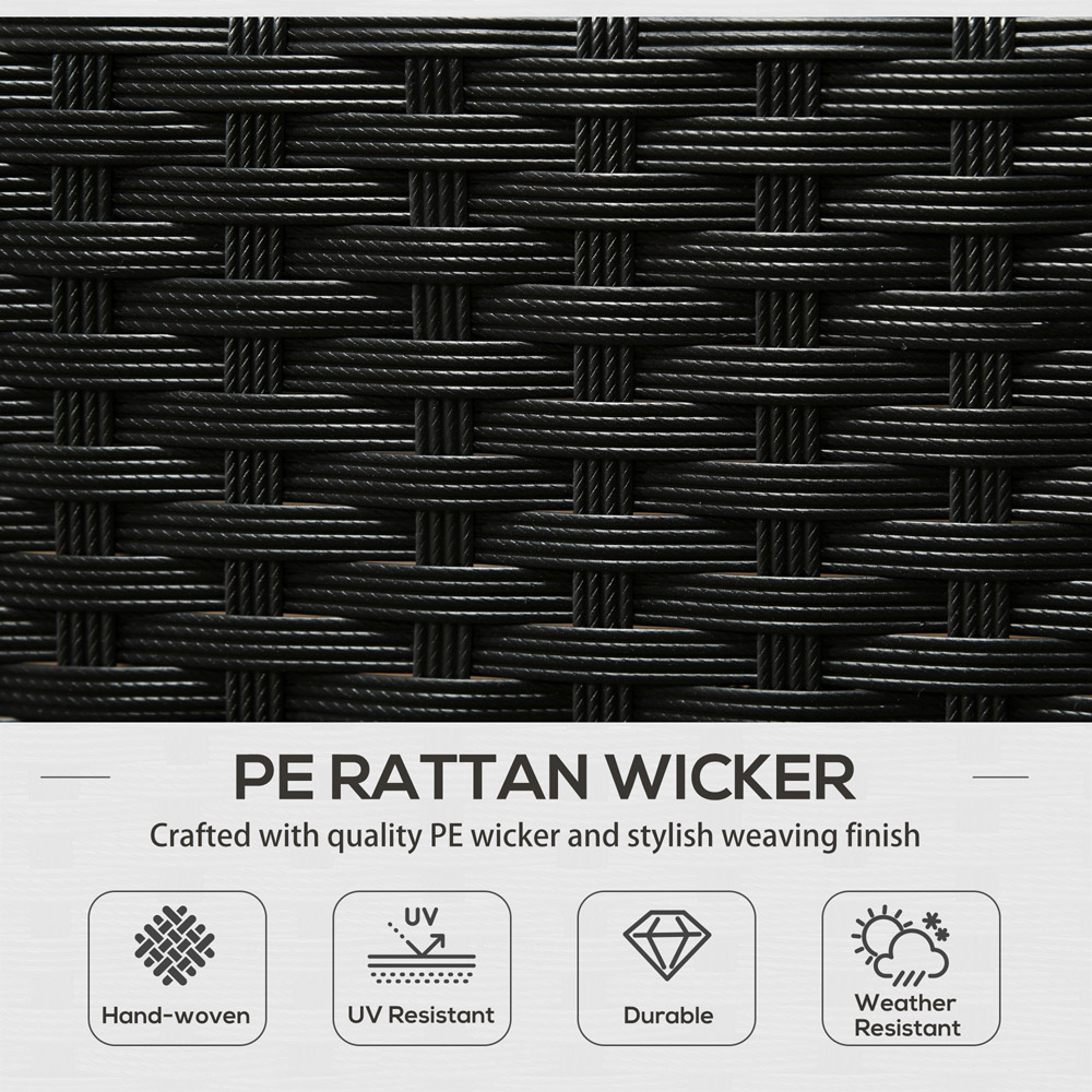 Make a restful addition to your outdoor space with the Outsunny Sofa Lounge Set. This five seater black set includes a sofa, two chairs, two footstools and a matching coffee table. It is ideal for placing on lawns, patios and conservatories as it has plenty of room for entertaining guests. This set offers relaxed garden seating for any outdoor living space. This set features sturdy, powder-coated metal frame covered with rattan for extra durability. It also features cosy cushions with removable cushion covers that are easily washable. Protect your garden furniture with our durable and waterproof covers. Explore our wide range of heavy-duty Garden Furniture covers to find the perfect fit for your needs.