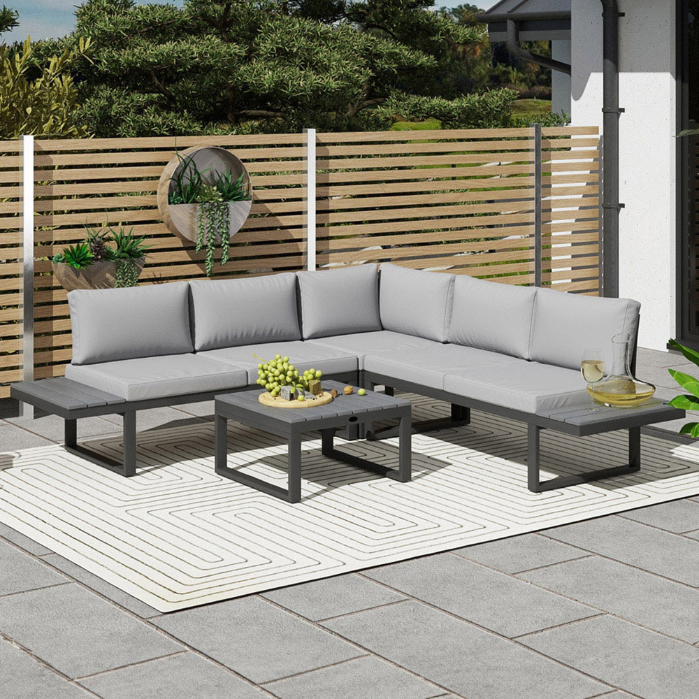 Create a stylish and comfortable outdoor haven with this Outsunny furniture set. This ensemble includes two loveseats, a corner seat, and a coordinating coffee table, all built for lasting enjoyment. The powder-coated steel frames ensure robust construction, while plush padded cushions offer exceptional comfort. The convenient coffee table provides a handy surface for drinks and other essentials.