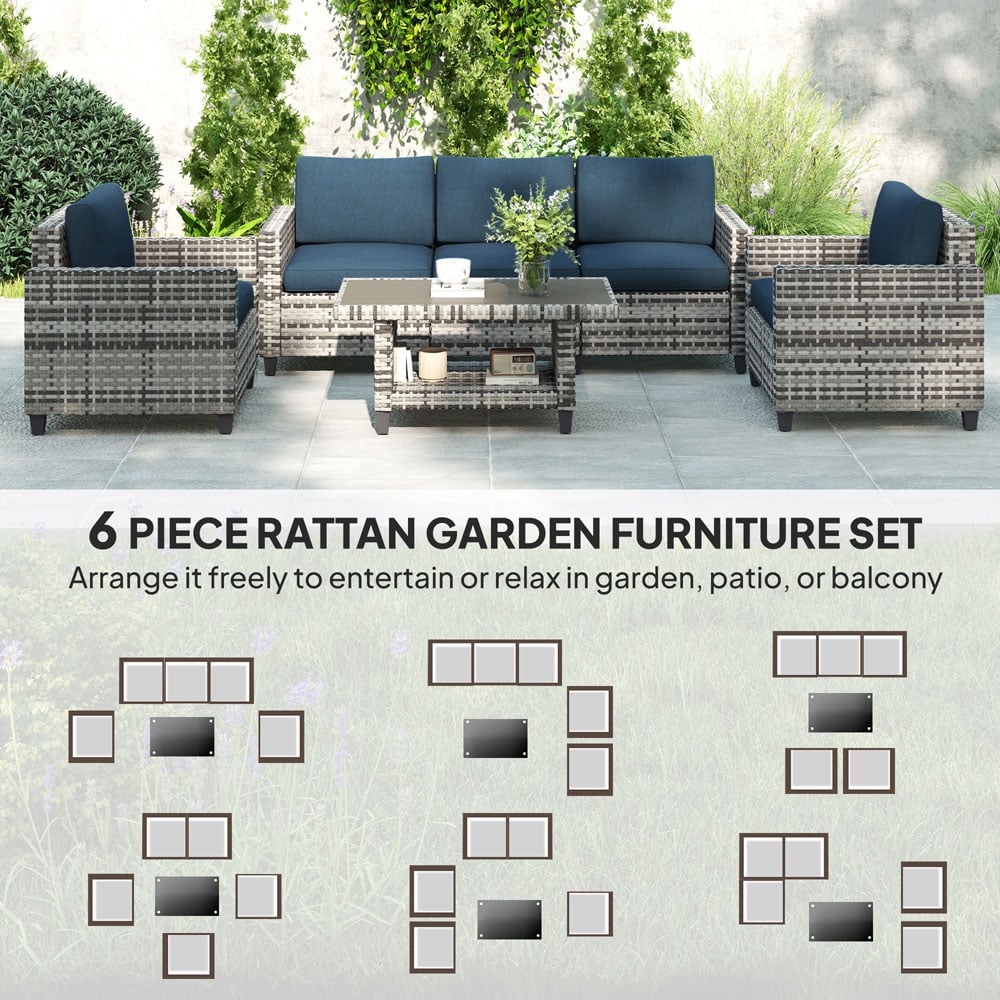 Create a welcoming outdoor space for friends and family with this six-piece garden sofa set from Outsunny. Comprising two corner chairs, a middle chair, two armchairs, and a coordinating coffee table, this modular set allows you to create a variety of configurations to perfectly suit your garden or patio. The sturdy, powder-coated steel frames are wrapped in stylish, durable plastic wicker for a robust rattan look. Sink into comfort with the included seat and back cushions, perfect for long afternoons of relaxation and conversation.