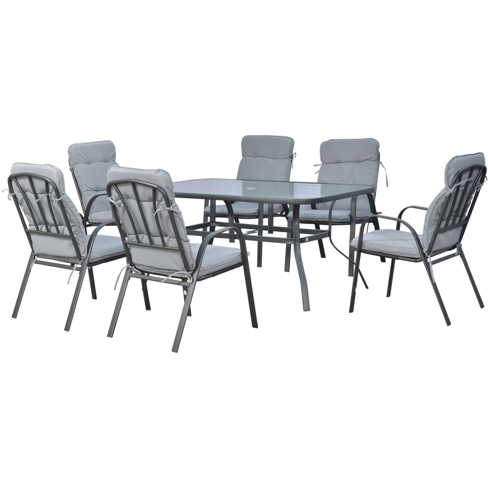 Get ready to socialise in style this summer with the Outsunny 6-Seater Black and Grey Garden Dining Set. Crafted with a robust steel frame, this set features six armchairs designed for comfort and a sleek table perfect for outdoor gatherings. The chairs boast high backs, supportive armrests, and padded seats, ensuring everyone enjoys their time outdoors. The table is topped with elegant tempered glass and includes a 38mm parasol hole, offering a cool spot of shade on sunny days. This garden dining set creates the perfect setting to comfortably spend time with friends and family.
