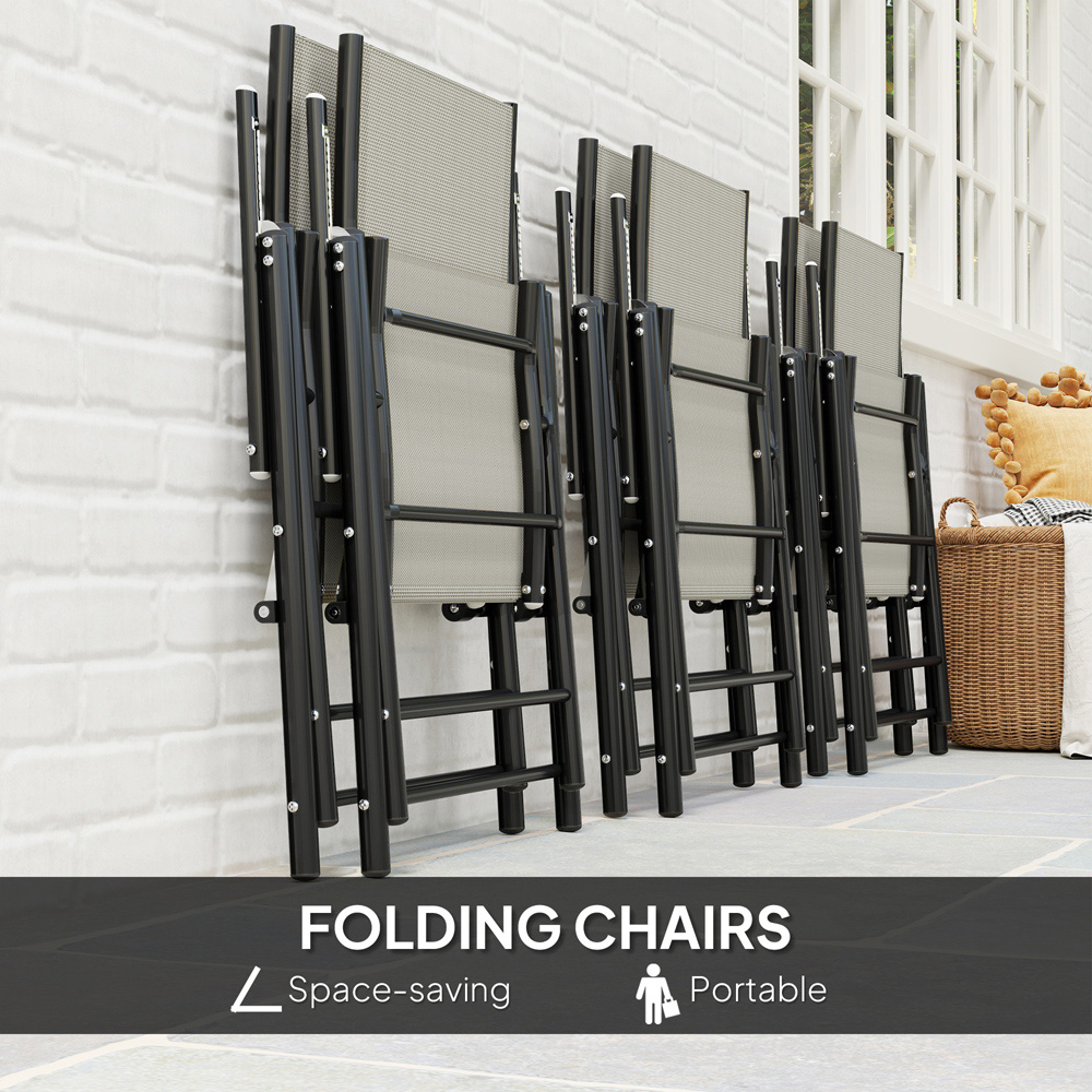 Enjoy al fresco dining in style with this Outsunny outdoor dining set. A rectangular table and six matching folding chairs provide ample space for entertaining. The robust powder-coated galvanised steel frames ensure durability, while the space-saving folding chairs feature breathable Texteline seats for comfortable gatherings. Conveniently, a 50mm hole in the tabletop is perfectly sized for a parasol, keeping you shaded on sunny days.