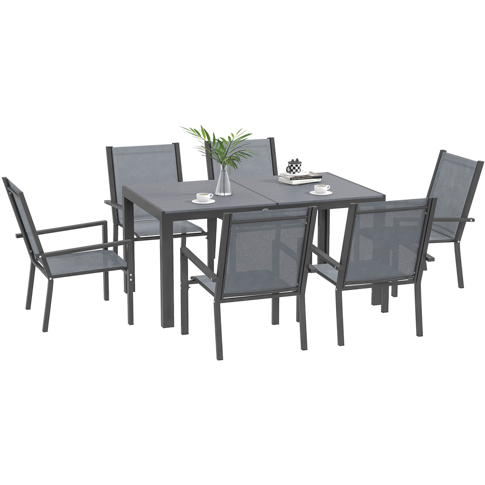 Transform your outdoor dining experience with the Outsunny Seven-Piece Grey Plastic Wood Dining Set, designed to effortlessly bring people together for meals any time of day. This charming ensemble includes six armchairs to sit with your favourite people, paired with a large table that provides plenty of dining room. Crafted from a robust combination of plastic and wood, the solid and sturdy tabletop is perfect for outdoor use. Its beautifully faded rustic finish adds a touch of warmth and character to your garden or patio. Enhanced with a durable powder-coated surface for extra strength, this set is built to withstand the elements. To keep your outdoor furniture in pristine condition, consider durable and waterproof covers designed for optimal protection.