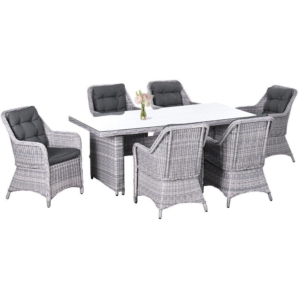 Outsunny 6 Seater Rattan Wicker Dining Set with Tempered Glass Tabletop and Cushions Grey