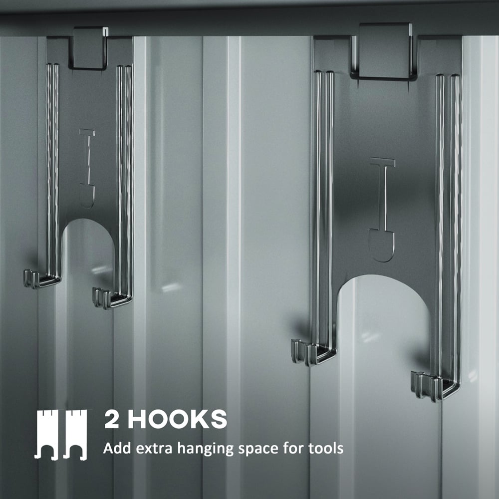 This robust 6.5ft x 4ft metal shed offers a practical storage solution for your garden equipment and valuable items. Its galvanised steel construction and waterproof roof provide reliable protection against the elements, keeping your belongings safe and dry year-round. Ventilating windows ensure good air circulation, preventing dampness and musty smells. Double sliding doors allow for easy access, while a secure locking mechanism adds an extra layer of protection against theft. The shed',s spacious interior comfortably accommodates bikes, long-handled tools, and other bulky items, such as shovels and seeds, and additional hooks provide handy storage for smaller equipment like water pipes and shovels. This low-maintenance shed is UV and water-resistant, providing a durable and secure storage option for your garden essentials.