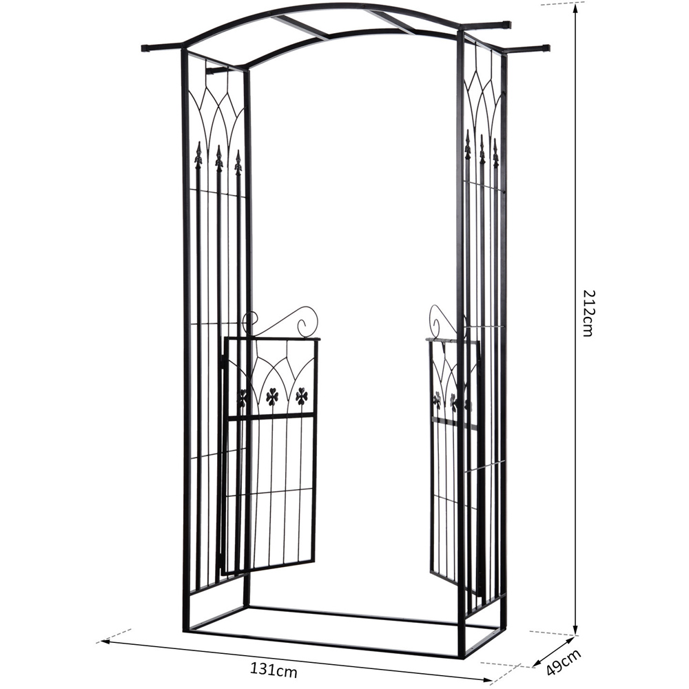Impress all your guests with this Outsunny Black Metal Garden Entrance Arch with Gate and Trellis Sides. Stylish and elegant, the frame is crafted into a tall and impressive design, while the trellis sides provide a place for vines and climbing plants to grow. The hanging rails on the top are perfect for flower baskets and the two doors at the front with elegant scrolling allow you to get through in the uttermost exquisite manner. For safety, the gate comes with latches for added peace of mind and the impressive size of this arch adds to the overall security. Strong and durable, the arch is made using powder-coated metal for extra sturdiness and durability.
