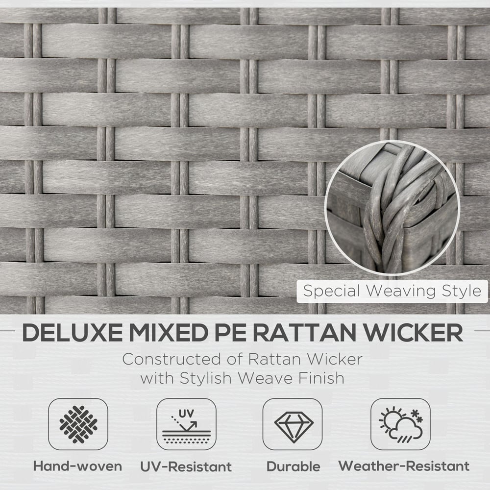 Elevate your garden with the Outsunny Rattan Sofa Lounge Set. Comprising three corner sofas, two footstools, and a long table, this grey set provides ample seating and relaxation space. The coffee table is topped with smooth glass, complemented by a woven rattan finish. Built with a strong aluminium frame and covered in durable PE wicker, this set is designed for both style and longevity. Sink into the thickly padded seats and back cushions, offering high-quality comfort; the cushion covers are also removable and washable for easy maintenance. Protect your garden furniture with our durable and waterproof covers.