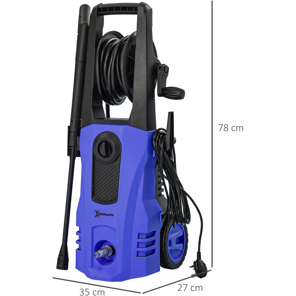 Effortlessly clean your outdoor spaces with this powerful pressure washer. Boasting an 1800W motor and delivering 510 litres of water per hour at 150 bar, it tackles even the most stubborn dirt. Ideal for vehicles, walls, decking, furniture, and fences, this portable unit includes a spray gun, wand, hose, inlet adaptor, snow foam bottle, and two nozzles with a cleaner. The integrated design neatly stores the gun, hose, and power cord, while the adjustable nozzle (0°–75°) offers precise water direction. Mobility is ensured with a six-metre hose, five-metre power cord, and integrated wheels, allowing you to easily cover extensive areas.