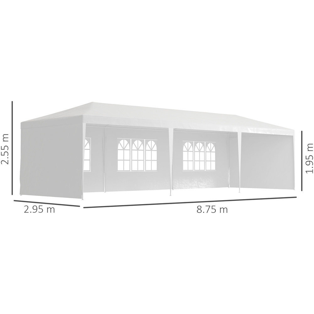 The Outsunny 9 x 3m White Party Tent Gazebo is an excellent addition for any entertaining occasion. Constructed with a solid steel frame and a high-quality 90g/m2 PE cloth, this gazebo offers durability and reliability. It also includes eight pull ropes and 16 ground anchors, ensuring stability even in windy conditions. Whether it's a wedding, camping trip, party, or picnic, this marquee gazebo with sides is versatile and suitable for various events.