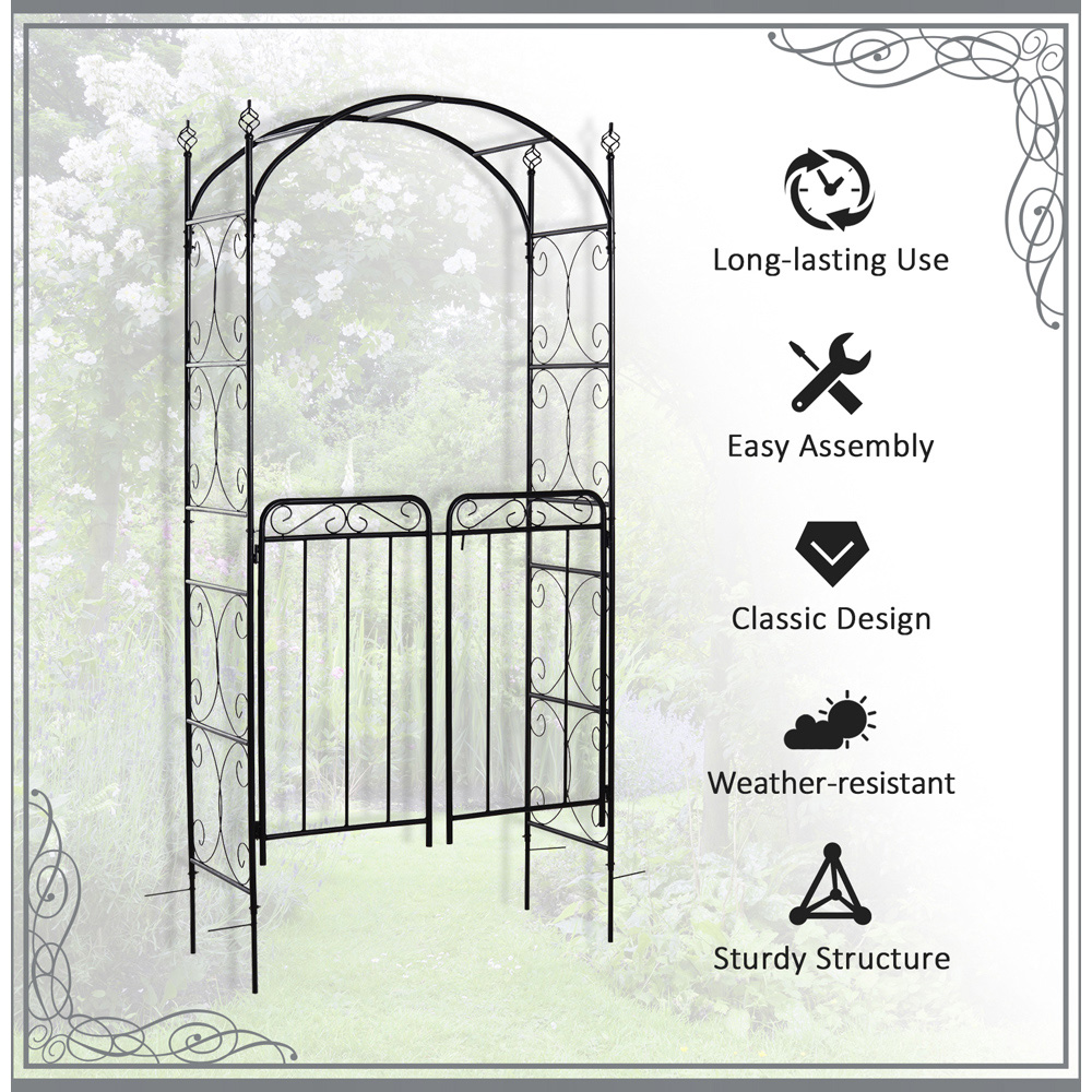 Create a magical gateway into your garden and beyond with this Outsunny Antique Black Metal Garden Arch with a Gate. Crafted with metal in a matte black powder coating, the frame of the gate is extremely tough and durable for a mainstay in your garden. The two doors on the front allow you to walk through while the trellis on the sides and bars at the top are perfect for hanging flower baskets to make a unique, colourful spot in your outdoor space. Perfect for small and large gardens alike, the archway makes a fantastic addition to any outdoor. For safety, it comes in a double gate design with latches for extra security when you're out. Size: 215x 45 x 108cm.