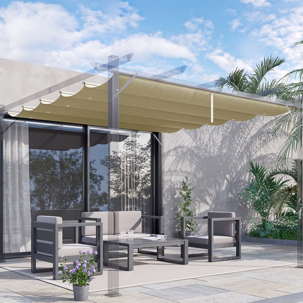 Provide a shady and comforting spot in the garden to be utilized all year round with an Outsunny Three x Three m Beige Retractable Pergola Gazebo. This adjustable canopy is crafted with beige polyester fabric to keep guests sheltered. With a retractable canopy roof, the metal pergola can be moved to any position, depending on the occasion and the weather. It is crafted from a plastic coating to protect against mild weathering. The canopy keeps you shaded on warm and sunny days, while the ten holes on the pergola canopy allow liquid to drain safely.