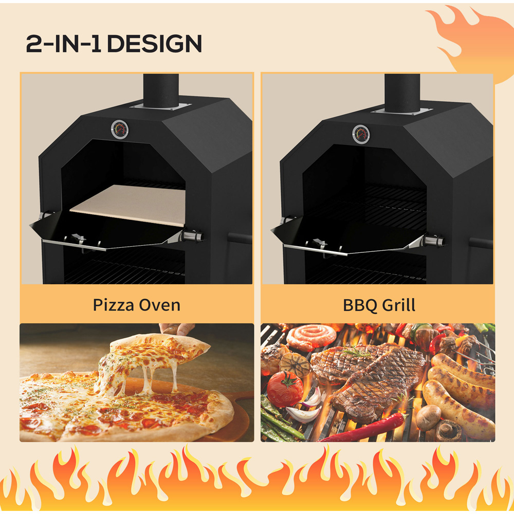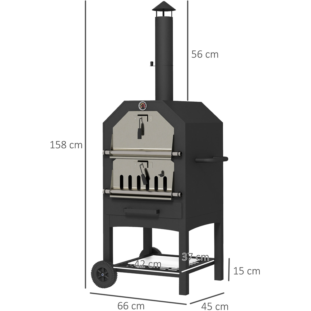 Create and cook restaurant-quality pizza in the comfort of your own home, thanks to this Outsunny Black 3 Tier Outdoor Pizza Oven. Don't settle just for the pizza, as it also comes with two grill grates for BBQ. It is made into an easy-use design, where a thermometer on the top keeps you aware of the heat level to avoid burning, along with a tall chimney which safely extracts the smoke upwards to protect you and others around. The tough shell with powder coating can easily withstand heat, rusting and scratch damage. And also equipped with a protective cover to resist water and dust, making it great for repeated use outdoors. This oven will be a great excuse for getting everyone over once the sun comes out to shine.