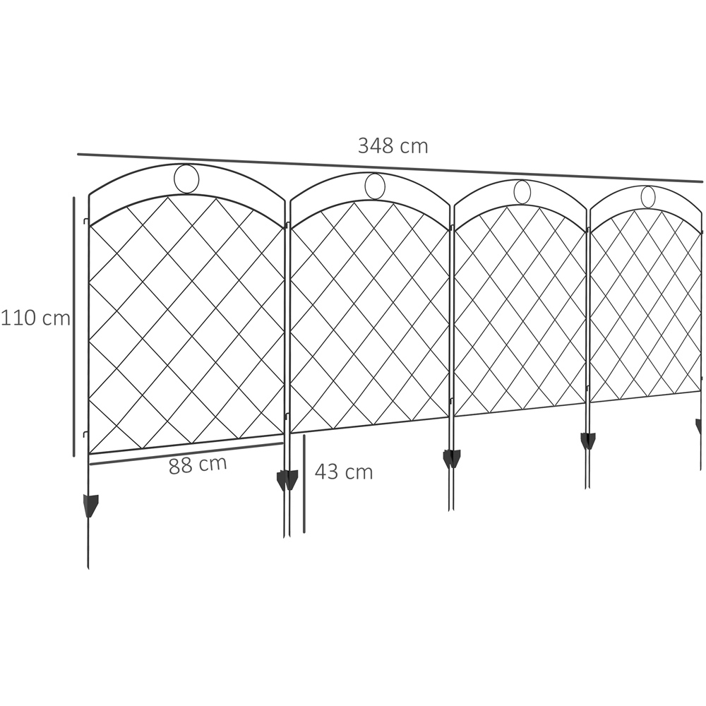 Enhance your garden',s aesthetic with this four-panel Outsunny black swirl fence set. Ideal for shaping around unusual garden layouts, each 3.5m long panel offers flexibility and a touch of elegance. The robust steel frame, strengthened by a durable powder coating, ensures lasting performance. The attractive grid design, topped with gentle curves, adds a sophisticated touch. Each panel measures 110cm H x 88cm L.