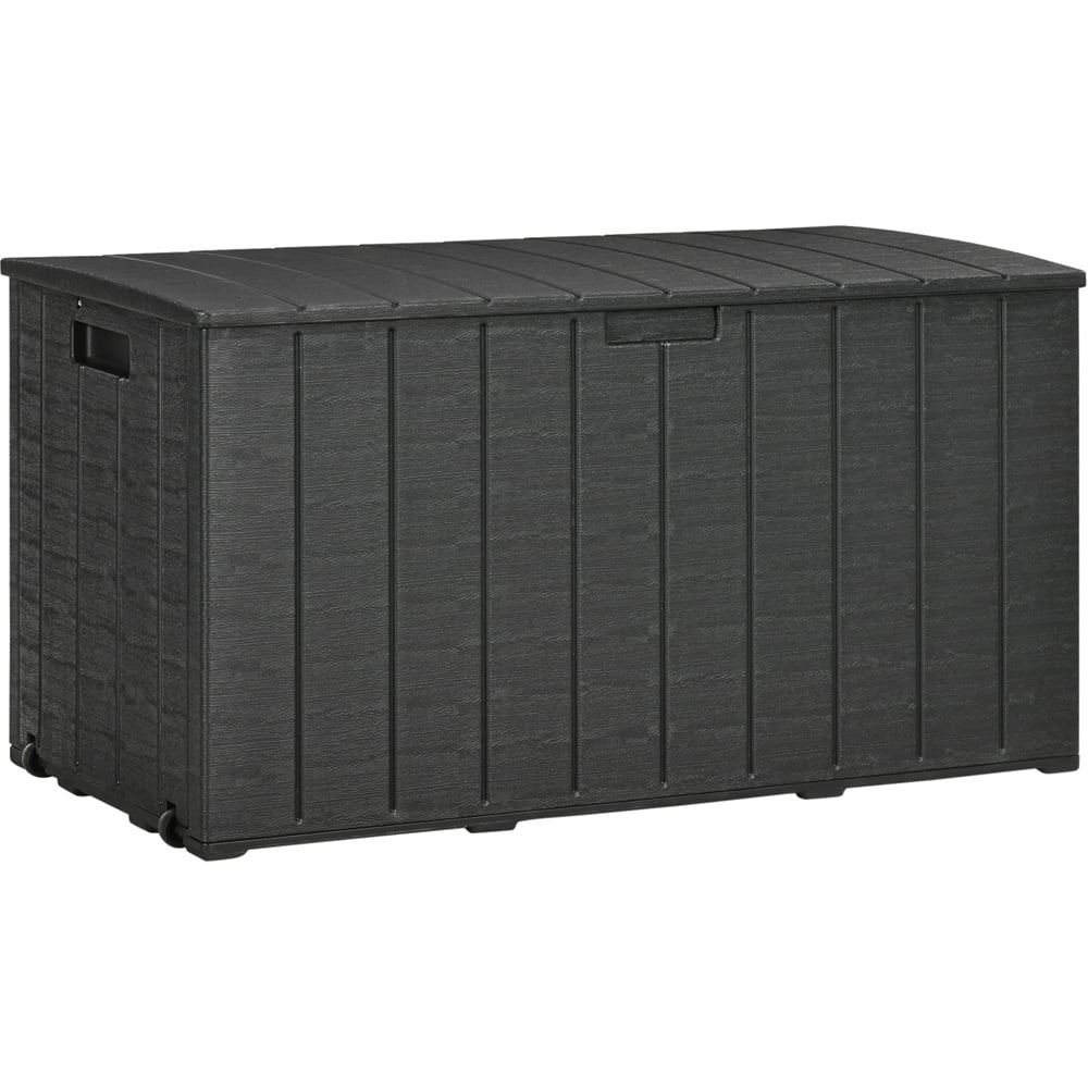 This Outsunny extra-large garden storage box is a tough and attractive addition to your outdoor space, offering a generous 366L of storage. Perfect for stowing away garden accessories, tools, and more, it measures 122.4 x 62cm. The durable plastic construction features a double-wall design for added strength. The smooth, hydraulic piston-assisted opening lid provides easy access, while two handles and rollers ensure effortless movement, whether the box is empty or full. Finished in black.