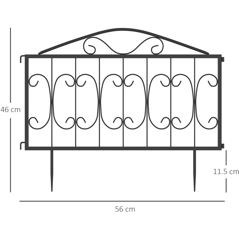 Add a touch of elegance to your outdoor space with this decorative black garden fence panel. Its curved design and stylish pattern create a charming border, perfect for defining garden areas, partitioning spaces, or enhancing your patio. Simply insert the ground stakes into soil or grass for quick and easy installation. The panels feature an interlocking mechanism, allowing you to connect multiple units and create a fence of your desired length. Each panel measures 1.5ft x 1.8ft, offering versatile landscaping solutions to protect your plants and add a touch of sophistication to your garden.