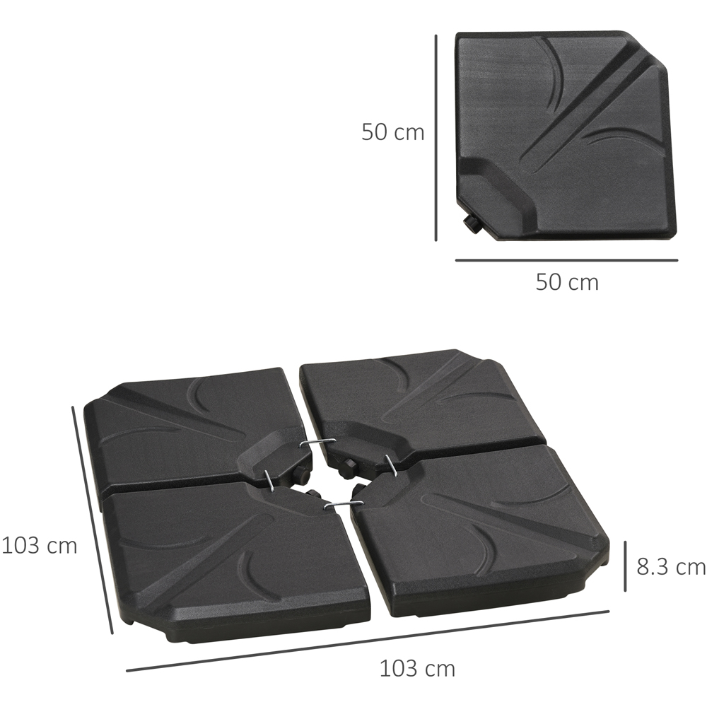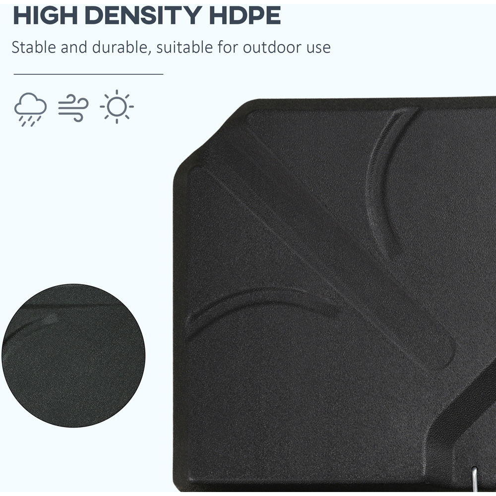 Ensure your parasols stand firmly in place with these Outsunny 4 Piece Black Parasol Base Stand Weights. Made from HDPE plastic, the weights are durable enough for outdoor use. Also, they feature a filling port and a screw cap to fill up with 12kg water/16kg sand or both for 19kg weight. When empty, these parasol bases are light to carry around as well. Please note: Cross base not included.