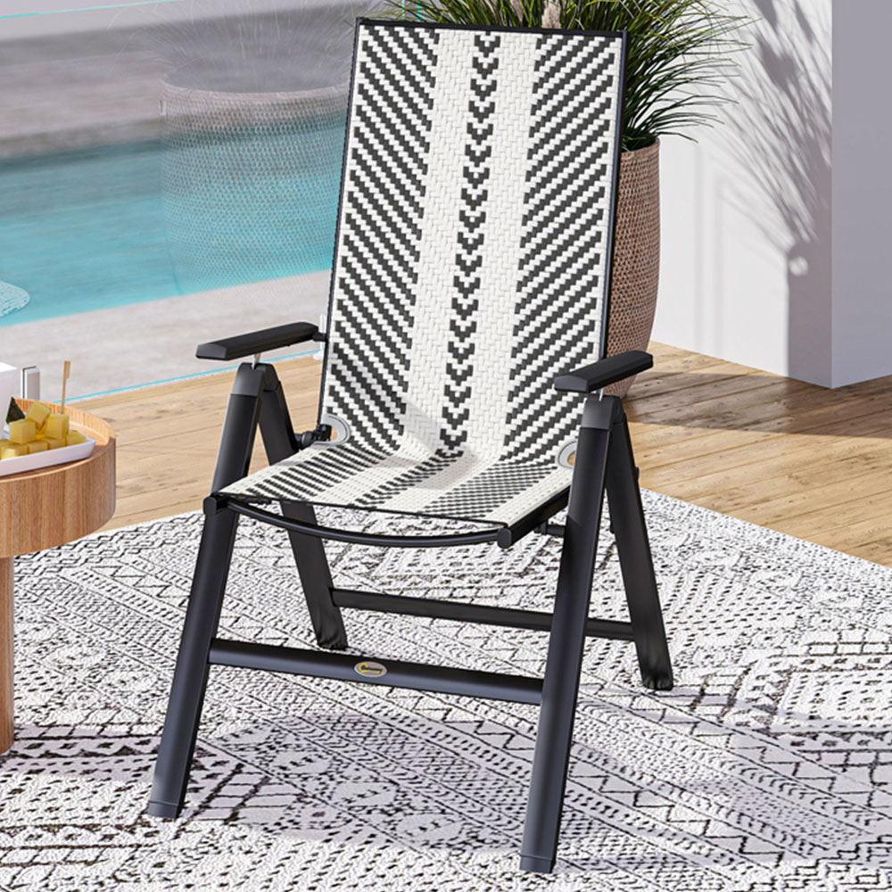 Relax and unwind with the Outsunny folding garden chair, designed for effortless storage and immediate enjoyment. Its foldable design allows you to conveniently pack it away when not in use, ready to be brought out whenever you desire. The chair features a five-position reclining back, adjustable to your preferred angle for reading, socialising, sunbathing, and more. The handwoven plastic wicker rattan seat offers a stylish garden aesthetic, providing both robustness and suitability for outdoor environments. Benefit from the high back and supportive arms, while the powder-coated steel frame ensures lasting strength and proper support for seasons to come.