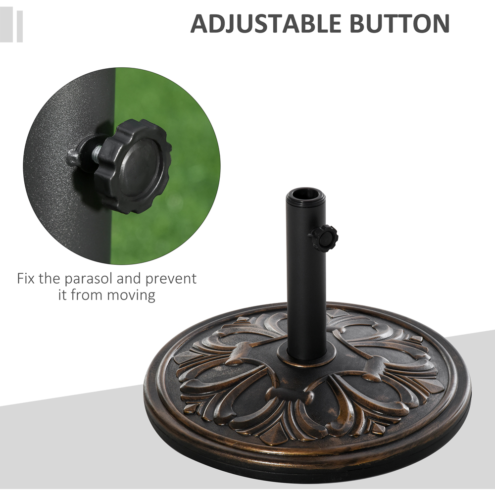 Ensure your parasol is kept firmly in place in all weather conditions with this Outsunny Bronze Tone Round Parasol Base. Made from a combination of HDPE, cement and metal, it weighs 13kg in total and can withstand even windy weather conditions. It is finished with a tightening screw and fits poles up to 48mm in diameter, allowing it to hold the parasol securely in place. Strong, beautiful and tough, it has been built to let you enjoy the sun with plenty of shade for years to come.