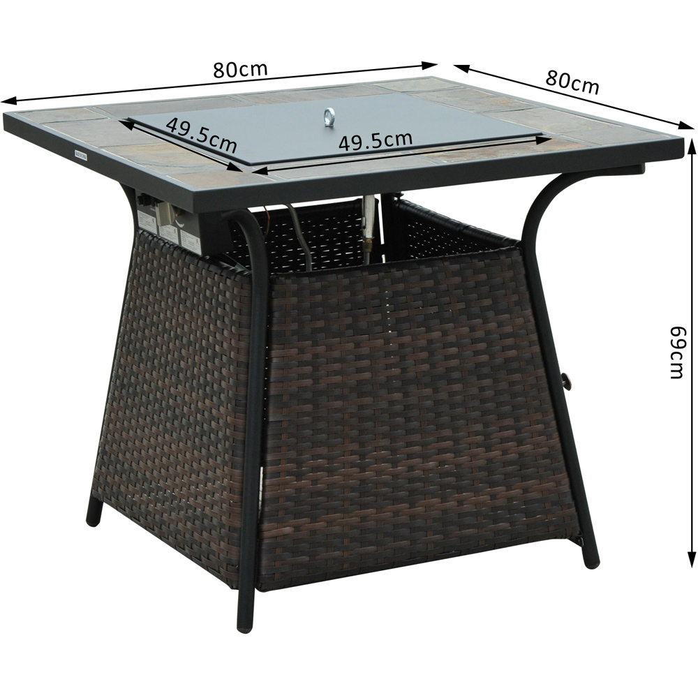 Looking for a stylish and efficient way to stay warm during the colder months? The Outsunny Brown and Black Rattan Fire Pit Table with 50000 BTU Burner is the perfect solution. Powered by propane gas, it's easy to use - simply add a gas bottle and light the fire. With a 50,000 BTU CSA-certified burner, you'll enjoy all the ambience of a classic fire without any of the messy ash cleanups. The flame and heat can be easily adjusted using the control, and the fire pit even comes with lava rock for added style. Featuring a beautiful slate table top with a lid, it's perfect for multiple uses. Plus, with a convenient side door for easy tank access and good airflow, you'll love everything about this amazing fire pit.