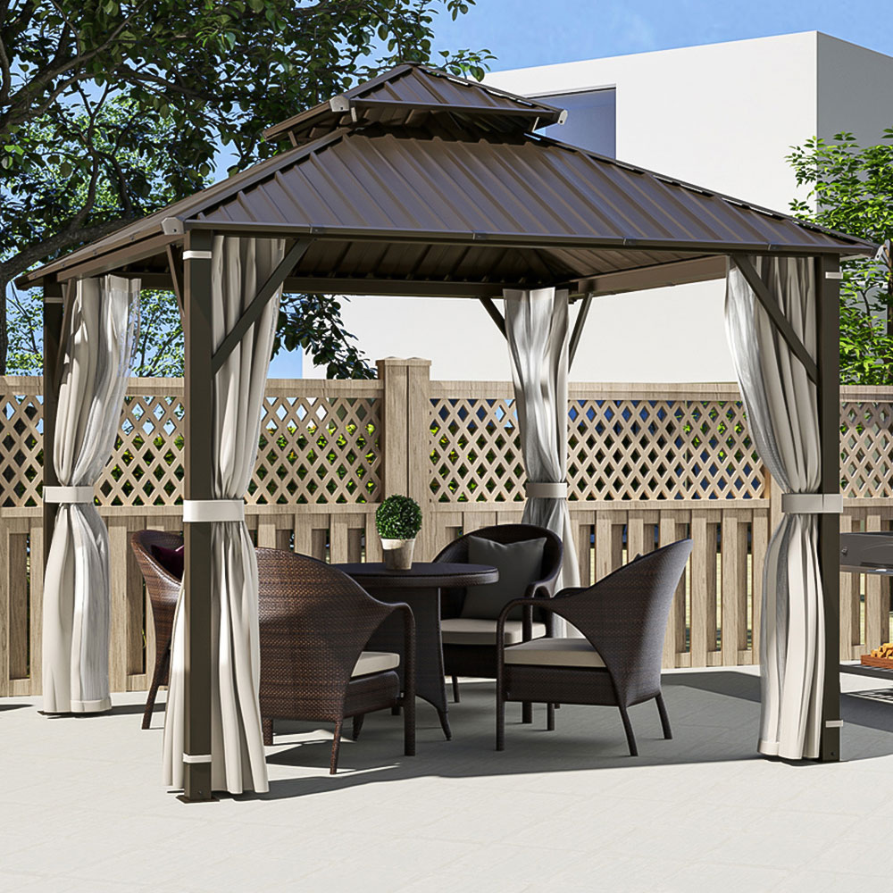 Outsunny Brown Metal Hardtop Gazebo with Netting and Curtains 3 x 3m