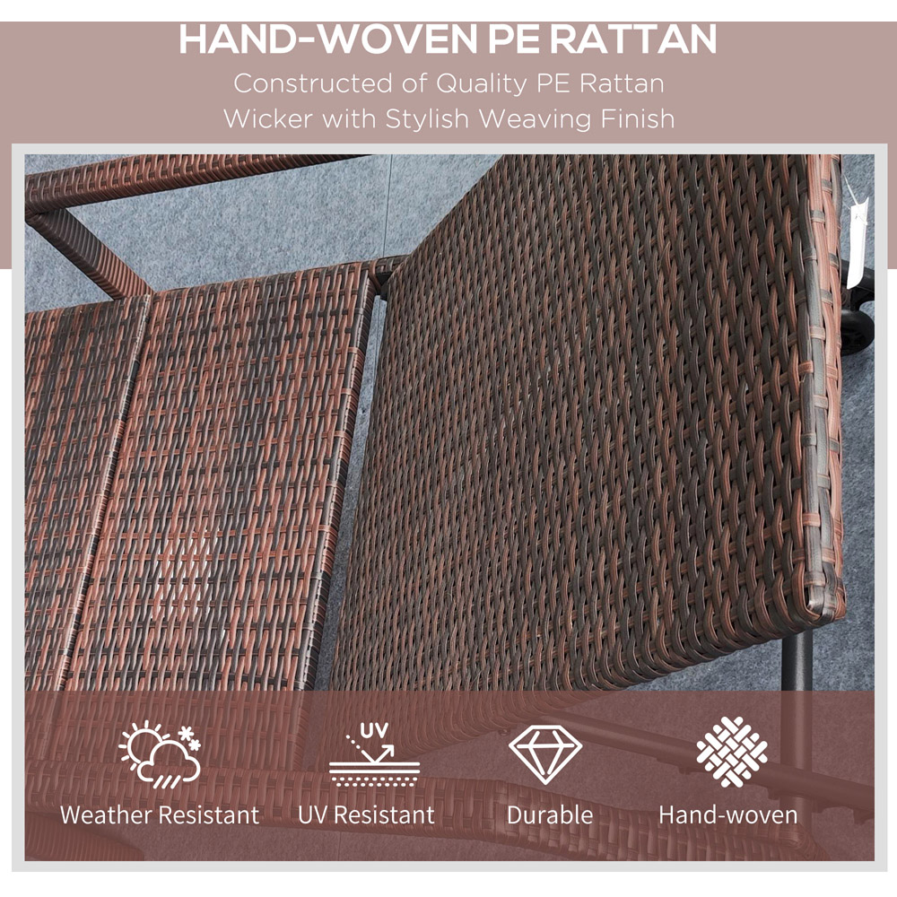 Bask in the sun's warmth with the Outsunny Rattan Sun Lounger. Constructed with weather-resistant PE wicker wrapped around a robust metal frame and sturdy base, this brown lounger is designed for lasting enjoyment. A soft, padded cushion ensures maximum comfort, while two integrated wheels allow for effortless repositioning. The backrest offers five adjustable levels, letting you find the perfect angle for relaxation. And for added protection, explore our wide range of heavy-duty garden furniture covers to keep your lounger looking its best.
