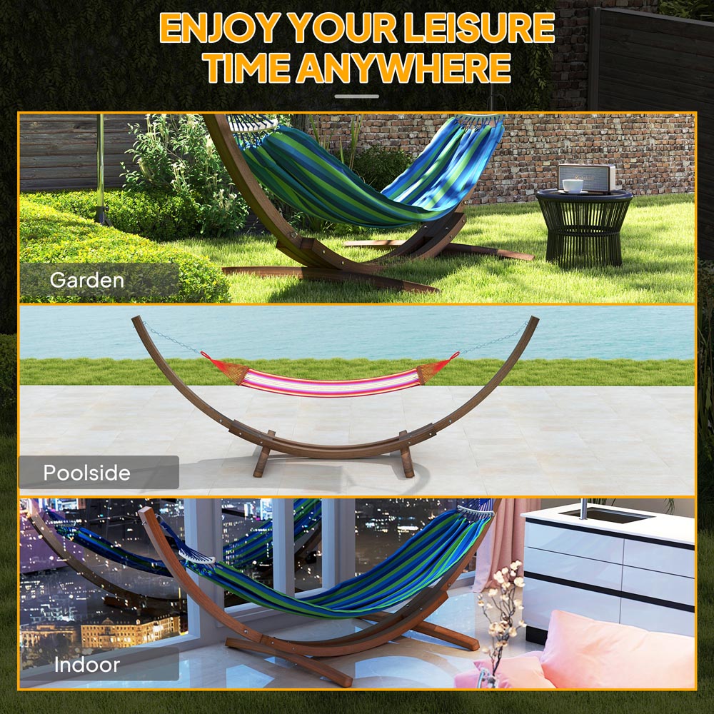 If you're after a hammock but lack the perfect hanging spot, this freestanding wooden hammock stand from Outsunny offers a superb solution. Crafted from robust solid wood, this stand provides exceptional stability and lasting durability. Perfectly suited for the balcony, garden, courtyard, porch, bedroom, living room, or any area you desire, it allows you to effortlessly enjoy leisure time without the need for perfectly spaced trees. Featuring a simple appearance with clean colour, this hammock stand is sure to help you relax.