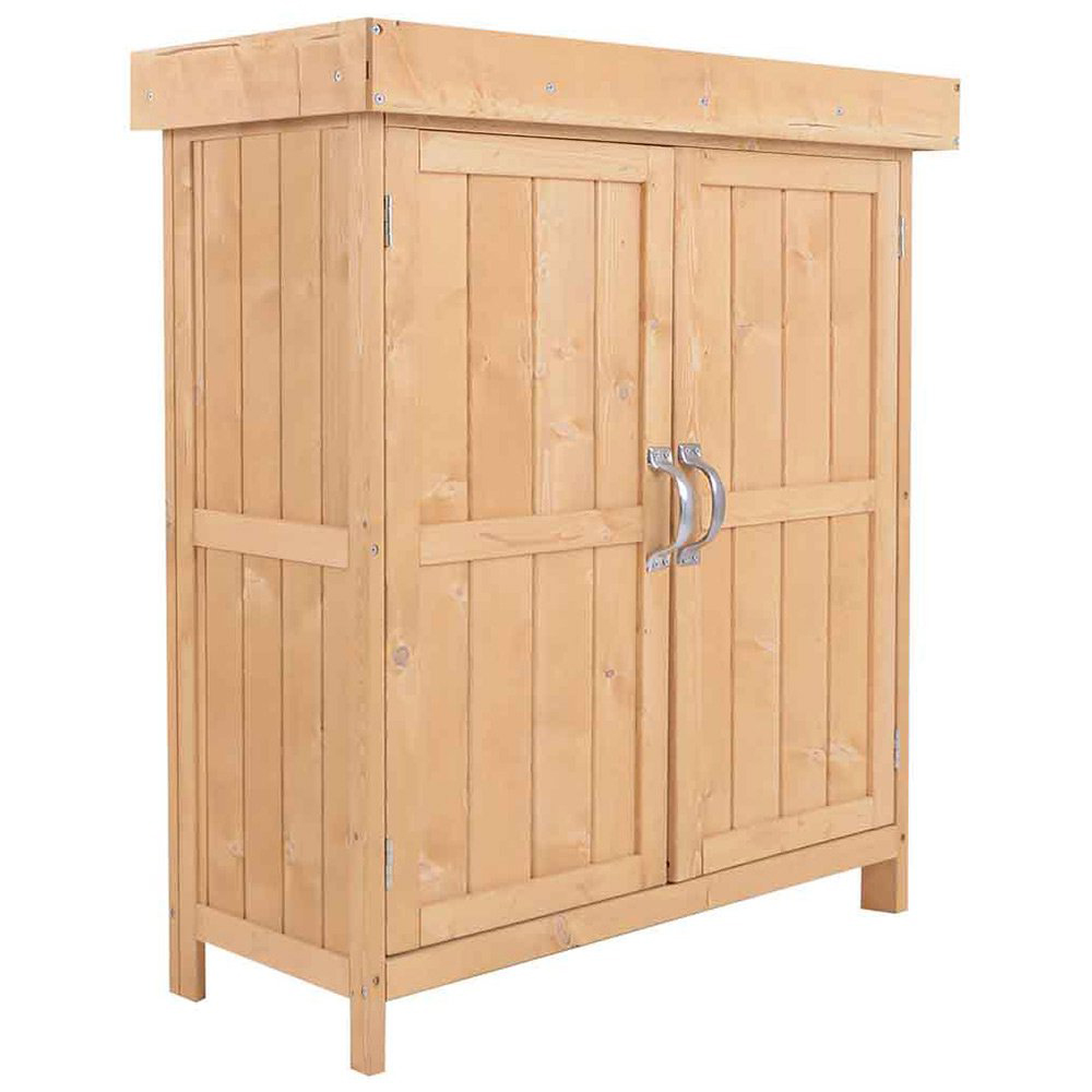 The Outsunny Burlywood Garden Storage Shed offers secure storage for all your gardening needs. Access your tools easily via double front doors or the convenient top lid. Built from solid wood for stability, this shed features a water-resistant asphalt roof and a painted wooden surface, ensuring durability for outdoor use. A hinged roof provides ventilation, and the two-tier shelving system offers ample space for organising your gardening tools and accessories. Product Dimensions: H88 x W43 x L74cm. Bottom Size: W37 x L69cm. Floor Space: 0.255m². Per Door Size: H69 x L32cm. Per Shelf Size: W33 x L65cm. Per Shelf Weight Capacity: 15kg.
