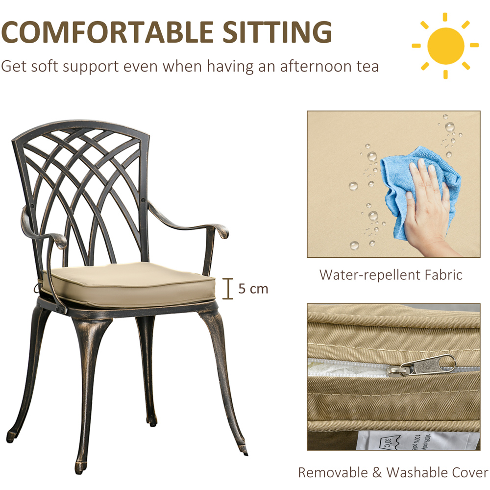 Add elegance and comfort to your outdoor space with this Outsunny Cast Aluminium 2 Seater Garden Bistro Set. With two chairs and a matching table, this bronze-coloured set is perfect for dining or drinking in the fresh air. Hand-crafted from solid cast aluminium and designed in an exceptional chic style, the bistro set will instantly enhance your outdoor experience. Also, it comes with two 45mm parasol holes in the middle of the table to keep a parasol in place and protect you from harmful UV rays. For comfort, the soft padded cushions on both seats ensure a comfortable sit for hours on end. Plus, the inner padding has a non-woven fabric cover so that it won't be messy after removing the outer cover. Protect your garden furniture with our durable and waterproof covers. Explore our wide range of heavy-duty Garden Furniture covers to find the perfect fit for your needs.