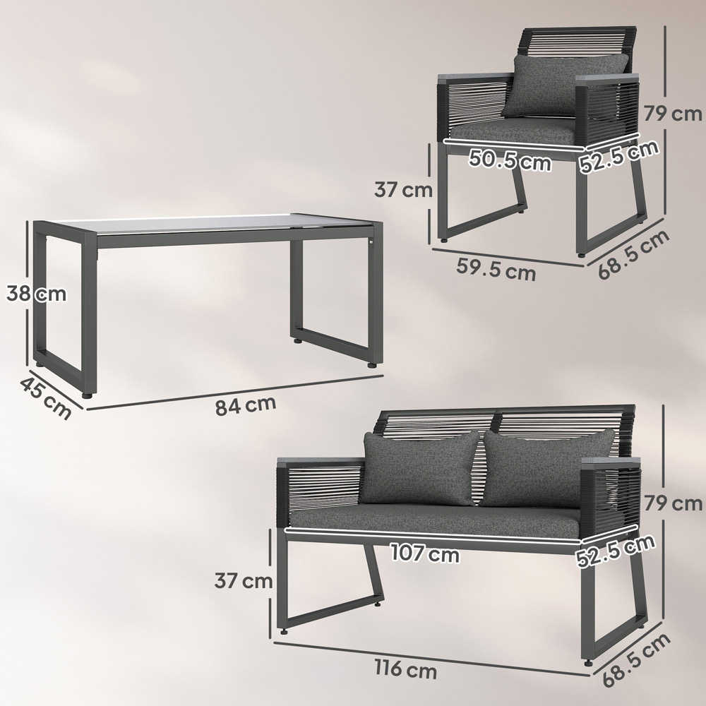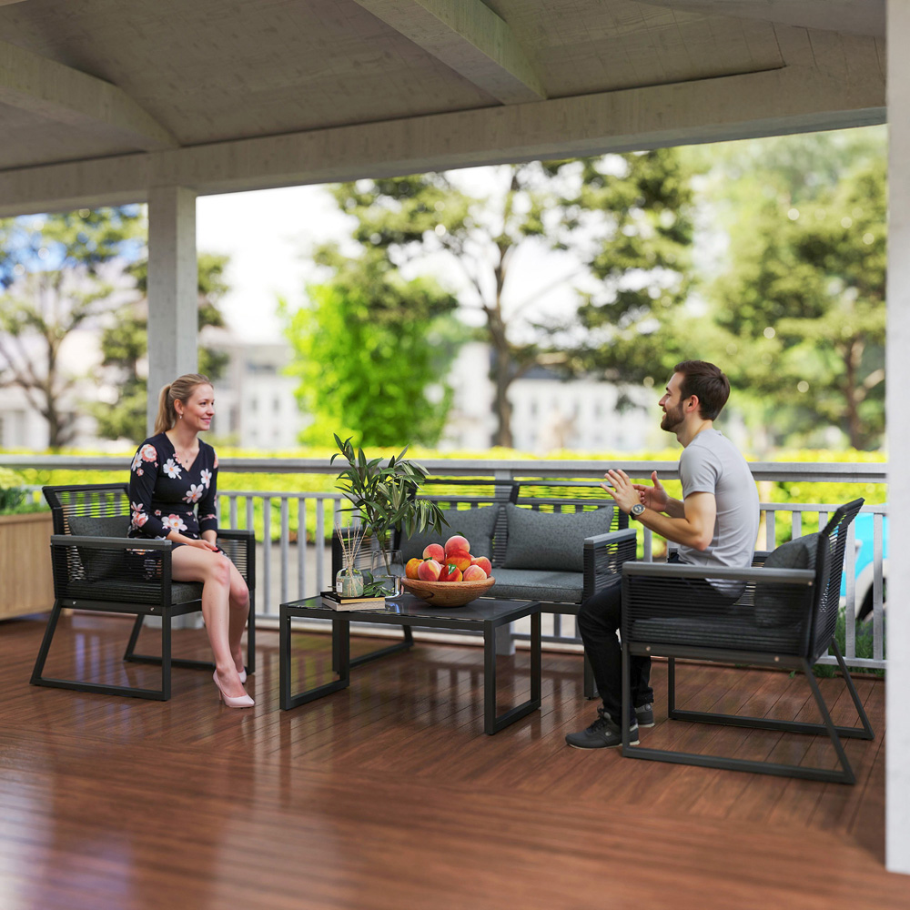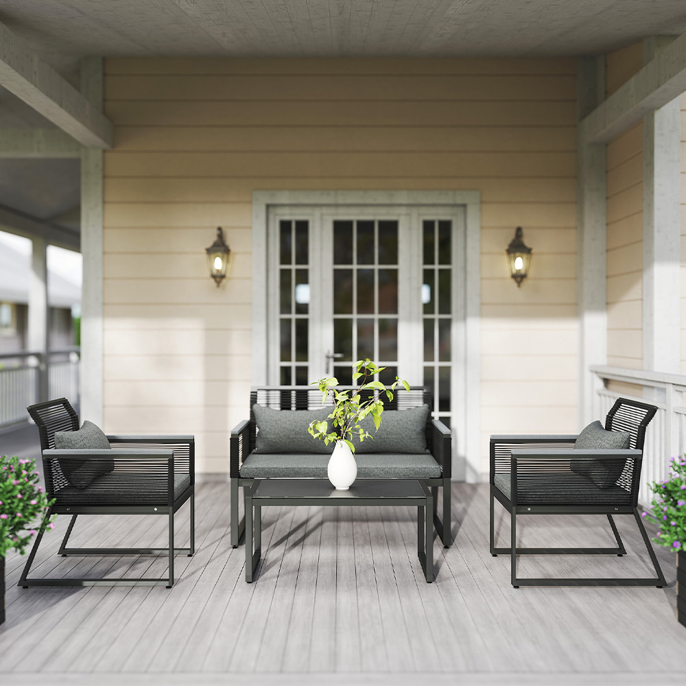 Crafted for relaxed outdoor living, this four-piece garden furniture set offers a contemporary aesthetic for your patio or garden. The set features a durable build, utilising quality PE rattan woven around a robust metal frame. It’s ideally suited for both covered outdoor spaces and open-air settings, bringing a touch of refined style to your porch, poolside, or garden.