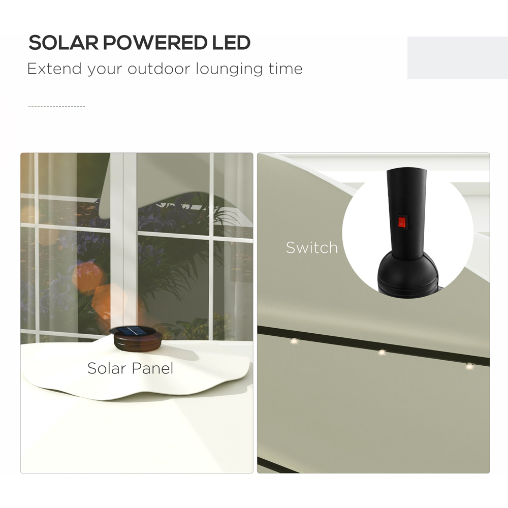 Elevate your outdoor space with this Outsunny Cream White Crank and Tilt LED Umbrella Parasol. This parasol comes with all eight ribs and solar-powered LEDs that light up once dark. The canopy can be tilted to a maximum 45° angle, which blocks light in different directions. Also, the crank handle makes opening and closing the canopy much simpler. Durable and sturdy, the powder-coated metal frame has a strong core that will last. Plus, the top vent allows air from the top and prevents the canopy from turning inside out. Looking for a way to keep your parasol secure and protected and enjoy some shade? Check out our selection of parasol bases, designed to keep your parasol in place while you relax and parasol cover to keep them protected.