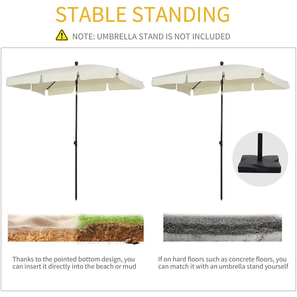 Make the sunny days even brighter with this Outsunny Cream White Rectangular Tilting Parasol. Made from aluminium, the pole provides strength and durability for years to come and supports the large canopy shade with four ribs for extra strength. Adjustable to different angles, the shade can provide sun shelter in many different directions up to 2.5m2 in total, which is great for staying out all day long. Also, it will perfectly protect you whilst you enjoy the warm and sunny weather. Looking for a way to keep your parasol secure and protected and enjoy some shade? Check out our selection of parasol bases, designed to keep your parasol in place while you relax and parasol cover to keep them protected.