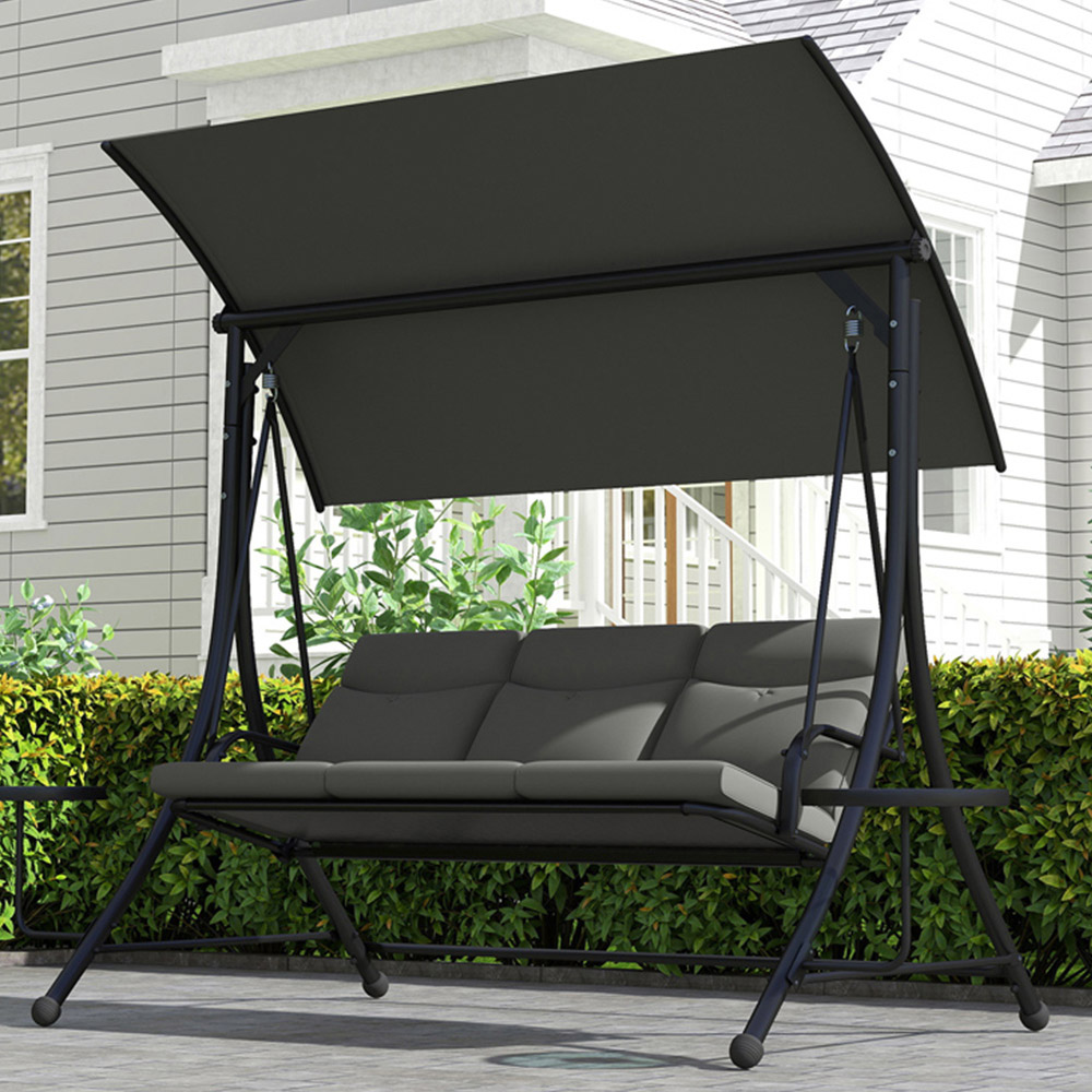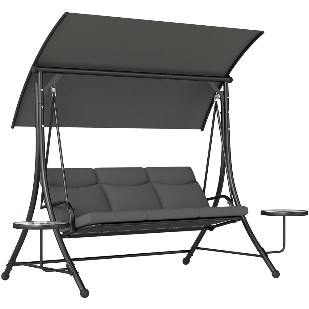 Introduce a modern twist to your outdoor relaxation with this updated patio swing. More convenient than ever, this Outsunny swing bench features two integrated glass tables. The robust steel frame, complete with stable A-shaped ends, ensures a balanced and secure swinging motion. Comfortably seating three, it offers ample space to unwind, enhanced by a padded seat and back cushion for comfort. Positioned on either side are round, glass-top tables, providing a safe and accessible spot for drinks, magazines, and other essentials. Furthermore, an adjustable canopy is included, offering shelter from the sun and light showers.