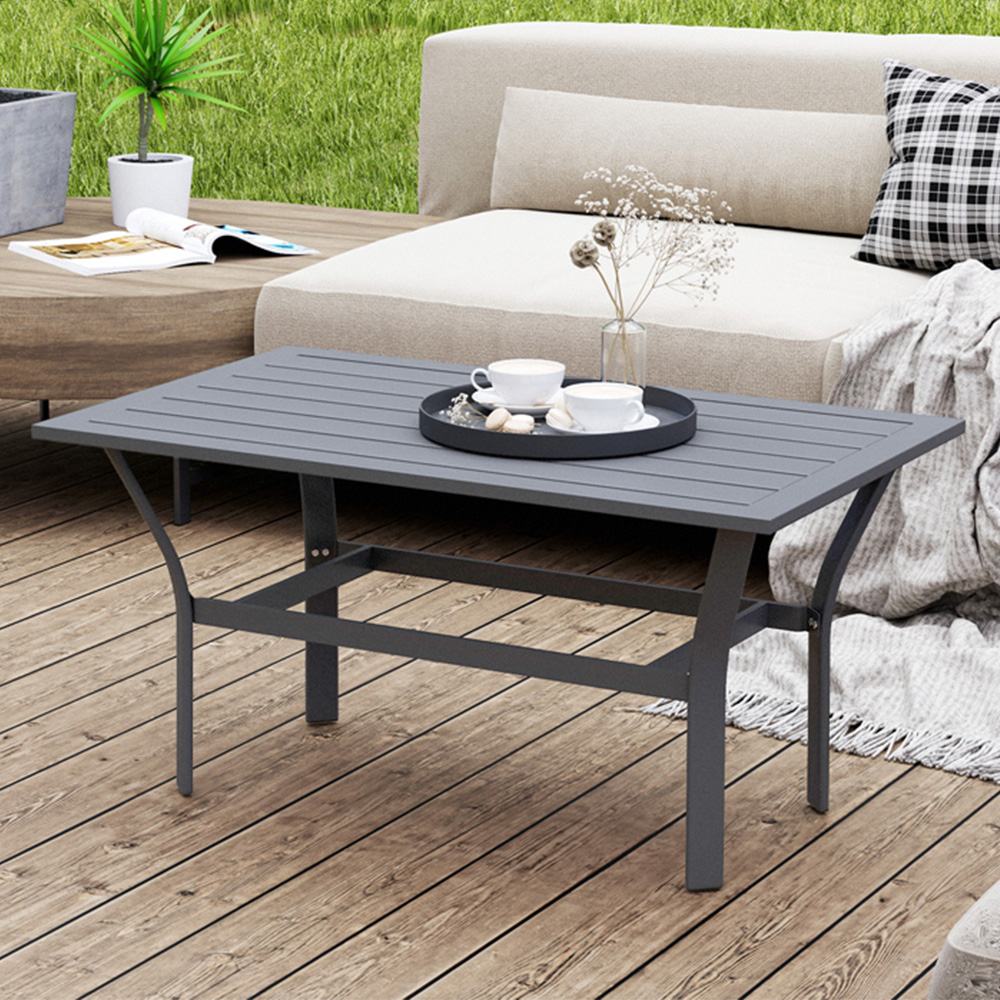 Enhance your outdoor living space with the Outsunny coffee table, a stylish and practical addition to any garden or balcony. Featuring a spacious slatted tabletop, measuring 91.5 x 55 cm, this table ensures quick drying and easy maintenance, keeping your outdoor area looking pristine. Built with a robust, weather-resistant metal frame, this garden side table is designed for longevity, promising to be a centrepiece in your outdoor setting for years to come. Embrace the perfect fusion of style and functionality, right outside your door.