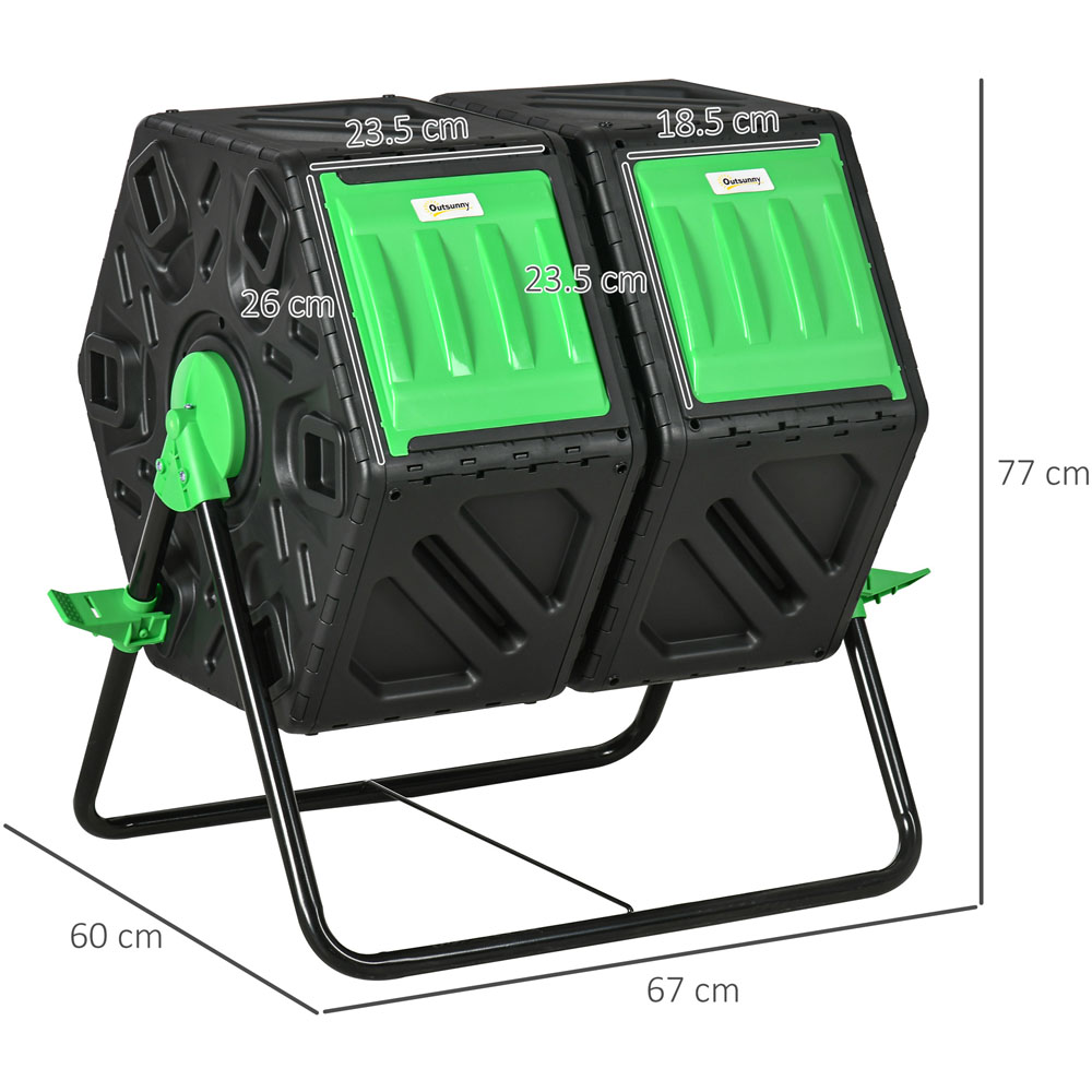 Create nutrient-rich compost effortlessly with the Outsunny Dual Chamber Compost Bin. This 130L composter transforms kitchen scraps into valuable plant food in just one to three months. Its clever dual-chamber design allows for continuous composting, doubling your output. The 360° rotating design ensures thorough mixing without the need to touch the contents, while 24 ventilation holes promote optimal airflow for efficient decomposition. Access your finished compost easily via the convenient chamber door (18.5W x 23.5Hcm). Made from durable steel and PP, this green and black composter measures 60L x 49W x 77H cm. Assembly is required.