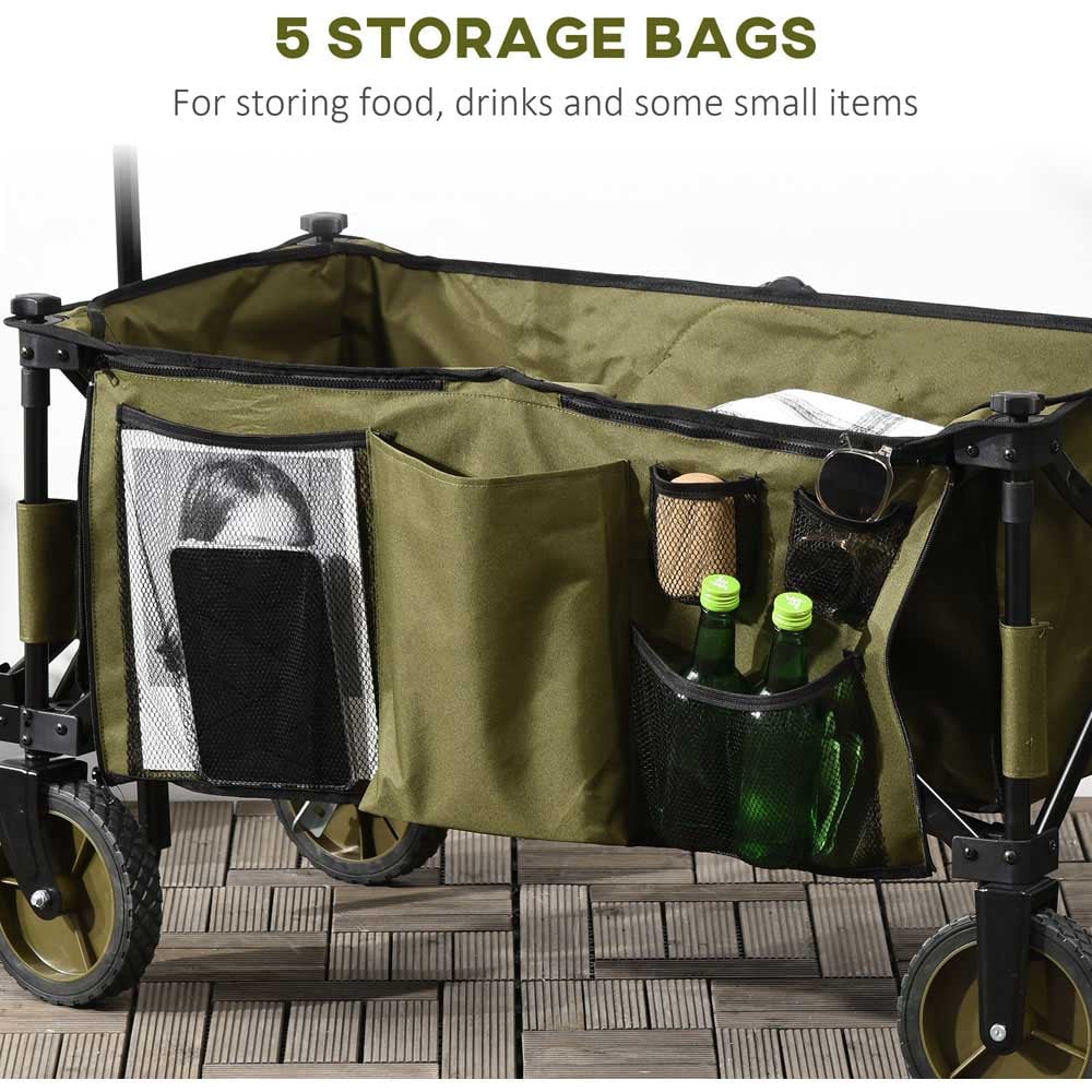 Whether you're off to the beach, attending festivals, or simply need assistance around the garden and home, this green folding garden trolley from Outsunny is a versatile companion. Built with a robust folding steel frame and a durable fabric bag, it keeps your belongings secure during transport. Manoeuvrability is a breeze thanks to the four wheels, complete with brakes for secure stops. The adjustable handle ensures comfortable pushing and pulling, while a top cover offers added protection for your contents. When not in use, its folding design allows for easy storage and portability. With overall dimensions of L 108 x W 55 x H 93cm, a carrying bag size of L 88 x W 47 x H 30cm, and a generous 125L carrying bag capacity, this trolley offers ample space. When folded, it measures just L 74 x W 32 x H 20cm. The handle height adjusts from 55-86cm, and the wheels measure 17.7 x 3.6cm. It boasts a static weight capacity of 120kg and a dynamic weight capacity of 100kg.