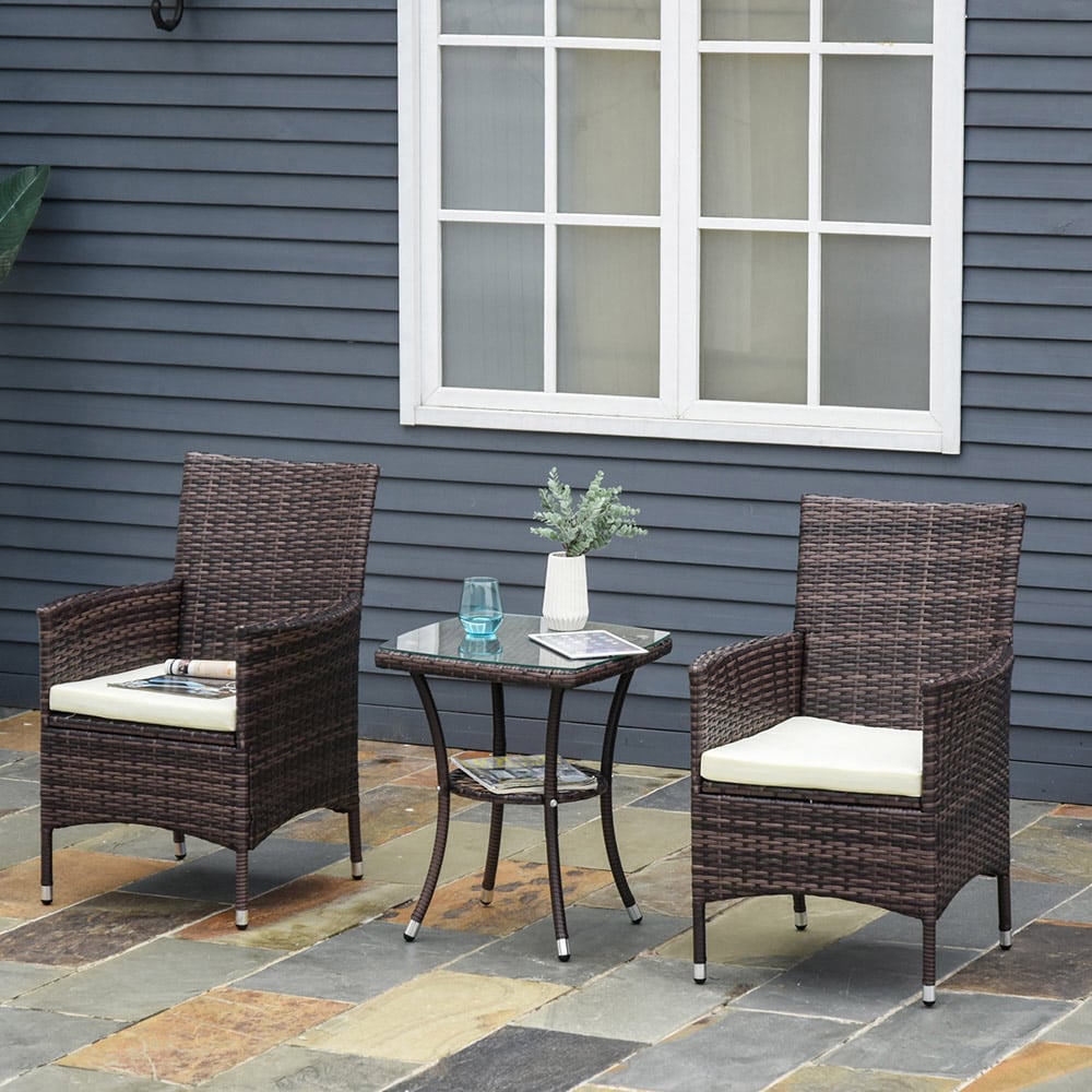Enjoy relaxing moments with this three-piece Outsunny rattan furniture set, ideal for patios, decks, sunrooms, or gardens. This charming bistro set includes a coffee table and two comfortable chairs, creating a classic focal point in any outdoor setting. Made from durable PE wicker rattan, it',s UV and water-resistant, built to withstand the elements and designed for lasting use. The lightweight yet sturdy construction, reinforced by a hidden rust-resistant steel frame, makes it easy to move and store. Sink into comfort with the extra-deep seating and thick, supportive cushions. This low-cost, all-weather set is perfect for backyards, balconies, poolside areas, and more. Its attractive design replicates the look and feel of traditional wicker, offering low-maintenance style and lasting appeal. Extend the life of your furniture with one of our durable, waterproof garden furniture covers.