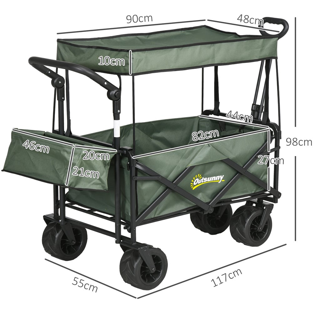 Effortlessly transport your belongings with the Outsunny Green Folding Beach Trolley. This spacious trolley boasts a large main compartment, ideal for carrying numerous items, and a handy side pocket for easy access to smaller essentials. Its clever folding design ensures compact storage when not in use. Convenience is key, a telescopic handle and integrated cup holder add to its practicality. The robust steel frame and 360-degree rotating wheels provide stability and smooth manoeuvrability across various terrains.