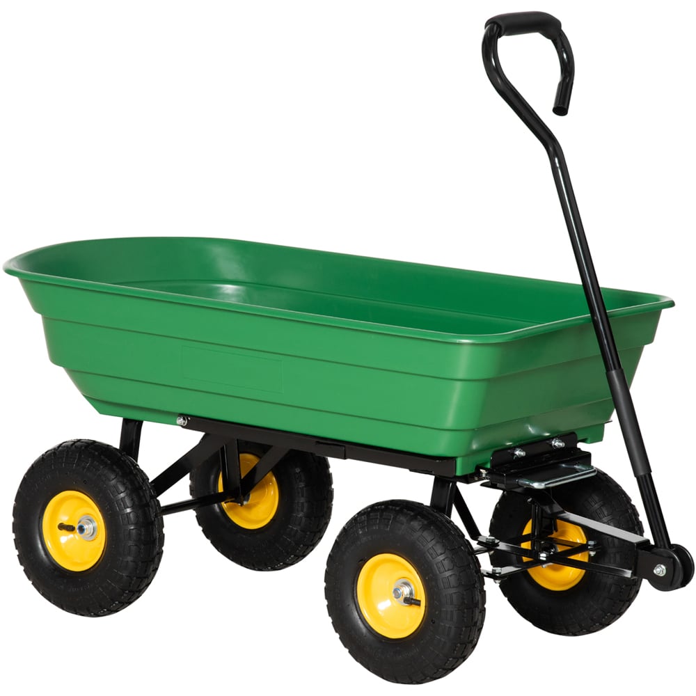 Effortlessly move and manage garden supplies with the Outsunny Green Garden Dump Trolley Cart – your new outdoor essential! This robust cart boasts a substantial 75L capacity, tackling a wide range of materials with ease. Whether you',re transporting soil, mulch, or tools, this trusty companion simplifies landscaping and gardening projects, saving you time and effort. Its high-quality steel frame with durable green finish ensures years of reliable, rust-free service. The adjustable handlebar offers comfortable control, and the patented quick-release dump design allows for swift and convenient unloading. The trolley can be tipped over to unload items conveniently. Say goodbye to back strain and hello to efficient garden management.