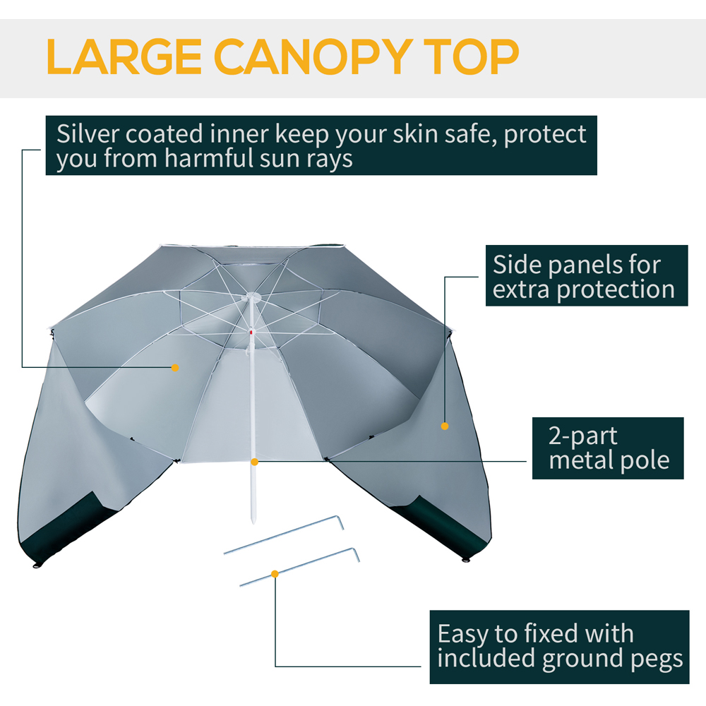 Beat the heat in style with the Outsunny Green Parasol with Curtains. The portable parasol functions as an efficient sun shade with a side covering to keep the wind away, making the beach parasol umbrella the perfect accessory for maximum protection from UV rays. This garden umbrella's polyester fabric has an inner silver coating that provides UPF-50 protection. Patio parasol top with tilt tent and vent for improved ventilation and additional cover. This sun parasol umbrella is a great option because of its telescope pole design and height adjustment feature. Equipped with side curtains to provide better wind, rain, and sun protection. To create the appearance and feel of a traditional outdoor umbrella, simply pull back the curtains as needed. You can secure your umbrella without the use of an umbrella stand thanks to the one D-shaped buckle and two ground pegs that come with this umbrella. Ideal for sandy beaches, parks, and riverbanks. Size: 2m. Looking for a way to keep your parasol secure and protected and enjoy some shade? Check out our selection of