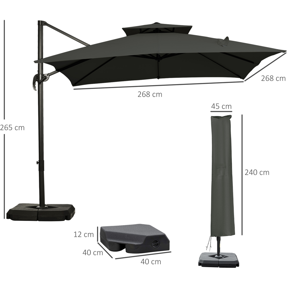 Keep yourself protected whilst enjoying the sun with this Outsunny Grey Square Crank and Tilt Cantilever Parasol with Base 3m. Made from aluminium, the solid central pole is durable for years of outdoor use. It is connected to the frame via eight metal ribs for extra strength. The water-resistant 180gsm polyester canopy protects from direct sunlight and heat, with a two-tier top to allow air to circulate. The parasol uses a crank mechanism for easy opening and closing. It can also rotate at seven angles and 360° to keep you covered all day. Looking for a way to keep your parasol secure and protected and enjoy some shade? Check out our selection of parasol bases, designed to keep your parasol in place while you relax and parasol cover to keep them protected.