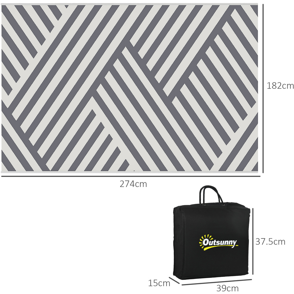 This Outsunny reversible outdoor rug in grey and cream is a stylish and practical addition to any indoor or outdoor space. Constructed from tear-resistant and water-resistant polypropylene, it's perfect for camping, picnics, festivals, or simply enhancing your garden. A protective coating shields it from weather damage and fading, ensuring long-lasting vibrancy. The reversible design lets you easily switch to a fresh side when needed, and it comes complete with a handy carry bag for effortless transportation. Simply fold it and go! Size: 182 x 274cm.