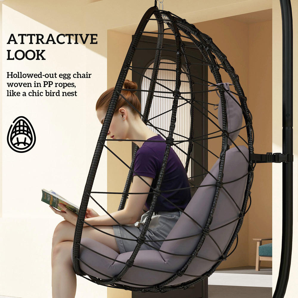 Create your own tranquil haven with this outdoor egg chair. Its unique, bird's nest-like design, crafted from weather-resistant PP rope, offers a wonderfully cosy escape. The clever folding design makes storage a breeze, perfect for smaller gardens or patios. Sink into the luxurious comfort of the 15cm thick cushion and accompanying headrest – pure relaxation awaits. A powder-coated steel frame and sturdy X-base ensure stability, while adjustable top chains let you customise your swinging experience to perfection. It's the ideal addition for those lazy summer afternoons.