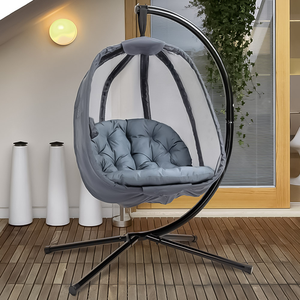 Bring a touch of relaxation to your home with the Outsunny Grey Hanging Egg Chair. This stylish egg chair features a robust steel frame, complete with a secure top hook for suspending the seating basket, and a balanced three-legged base. Designed for simple hook up and take off, making it easy to store away and keep clean. It includes a large, generously padded cushion, inviting you to sink in and unwind in ultimate comfort. Ideal for both indoor and outdoor use, this egg chair is a versatile addition to any space.