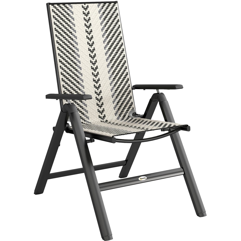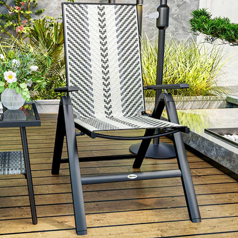 Unwind in style with the Outsunny folding garden chair, designed for effortless relaxation. Its foldable design ensures convenient storage and portability, ready for use whenever you desire. The five-position reclining back allows you to adjust the chair to your preferred angle, perfect for reading, socialising, or soaking up the sun. Featuring handwoven plastic wicker rattan seats, this chair offers a stylish garden aesthetic whilst remaining robust and suitable for outdoor use. The high back and armrests provide ample support, complemented by a powder-coated steel frame for enhanced strength and durability, ensuring seasons of outdoor enjoyment.