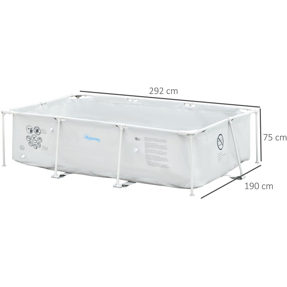 Make a splash this summer with the Outsunny Grey Rectangular Paddling Pool. This portable pool provides family fun and fitness, becoming an instant social hub. The integrated filter pump and cartridge ensure crystal-clear water circulation. Robust 1000D PVC sidewalls offer superior resistance to abrasion, impacts, and sun damage. A strong, durable steel frame, with a rust-resistant paint finish, provides lasting support. Its wide base ensures stability and prevents leaks. Dimensions: 292 x 190 x 75cm.